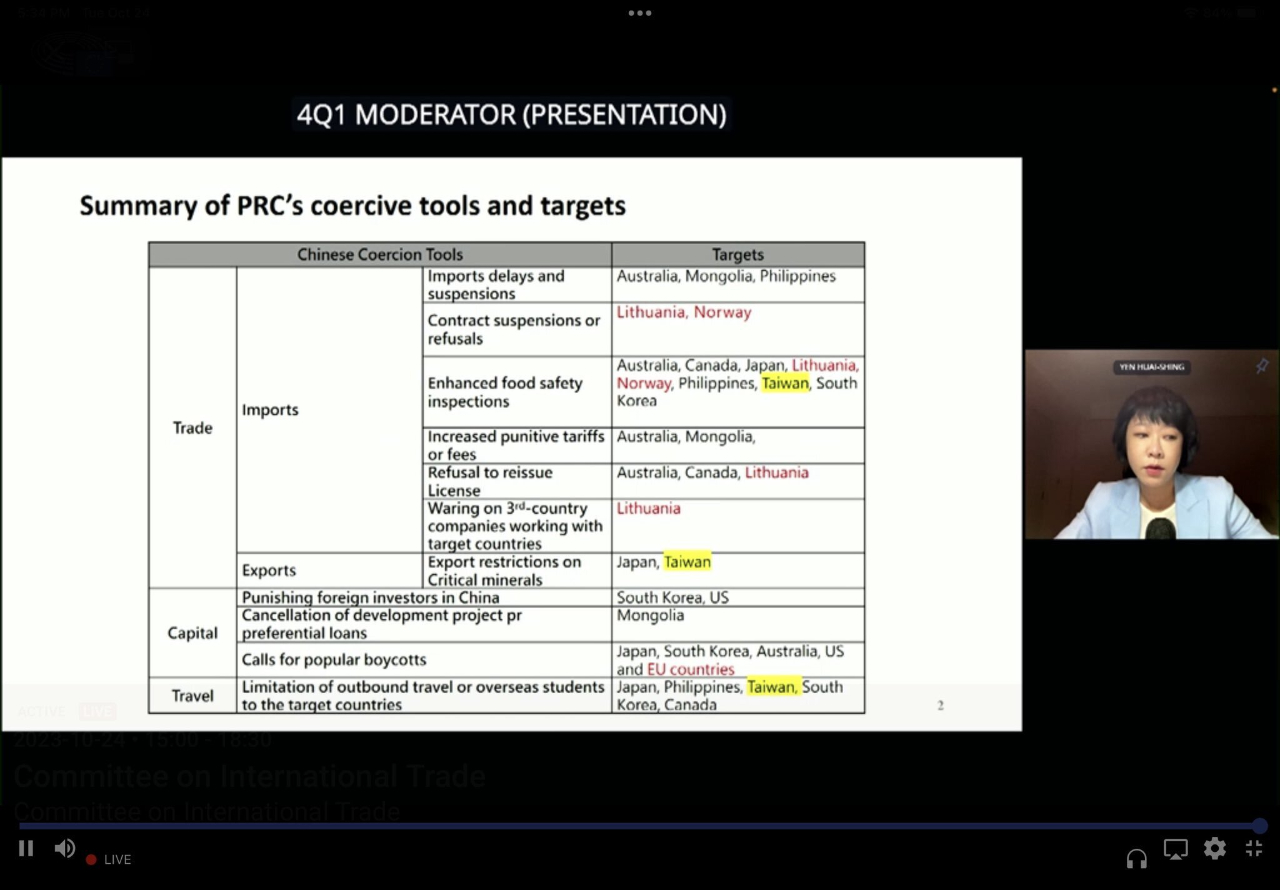 歐洲議會國貿委員會(INTA)於10月24日在歐洲議會舉行歐洲經濟安全(European Economic Security)公聽會,邀請中華經濟研究院WTO及RTA中心顏資深副執行長慧欣出席,分享台灣對抗中國經濟脅迫的經驗。國貿委員會主席Bernd LANGE親自主持公聽會,由此可見台灣對抗經濟脅迫的經驗對於歐洲經濟安全甚具啟發性及重要性。
