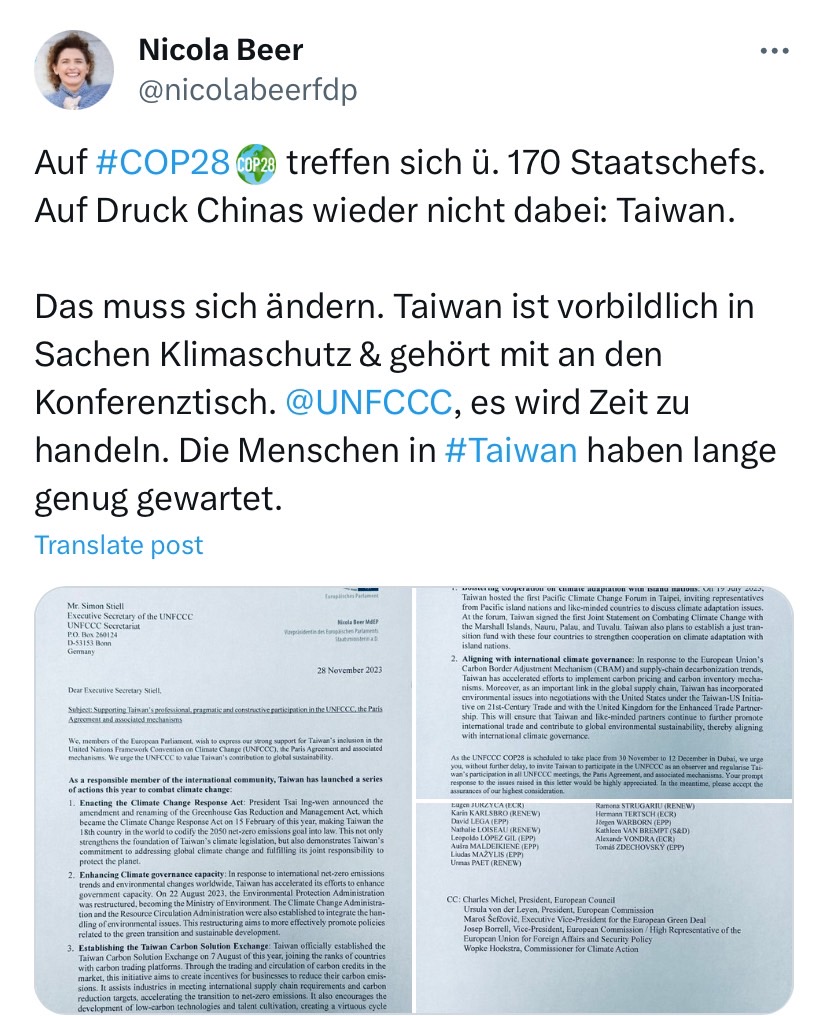 歐洲議會副議長畢爾(Nicola Beer)於11月28日領銜,率31位歐洲議會議員聯名致函聯合國氣候變化綱要公約(UNFCCC)執行秘書Simon Stiell,強力支持台灣參與UNFCCC及「巴黎協定」(Paris Agreement),並敦促UNFCCC肯定台灣對全球永續發展所做的努力。歐洲地區「福爾摩沙俱樂部」(Formosa Club)各國共同主席及成員,超過200位跨國議員也做出相同呼籲。駐歐盟兼駐比利時代表處對歐洲議會畢爾副議長、歐洲議會議員及歐洲跨國議會平台議員再次以實際行動聲援台灣的國際參與,表達誠摯歡迎及感謝。