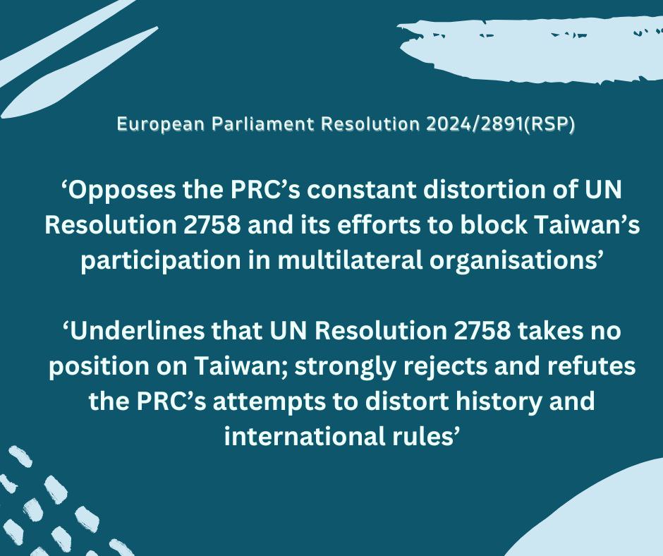 歐洲議會10月24日在史特拉斯堡全會以壓倒性多數(432票贊成,60票反對,71票棄權)表決通過「中華人民共和國不當詮釋聯合國第2758號決議及對台灣持續軍事挑釁」決議案(People’s Republic of China’s misinterpretation of the UN resolution 2758 and its continuous military provocation around Taiwan),反對中華人民共和國持續扭曲聯合國第2758號決議並阻撓台灣參與多邊組織,強烈譴責中國對台軍事挑釁,並反對任何片面改變台海現狀的行為。本處對此表達誠摯歡迎與感謝。
