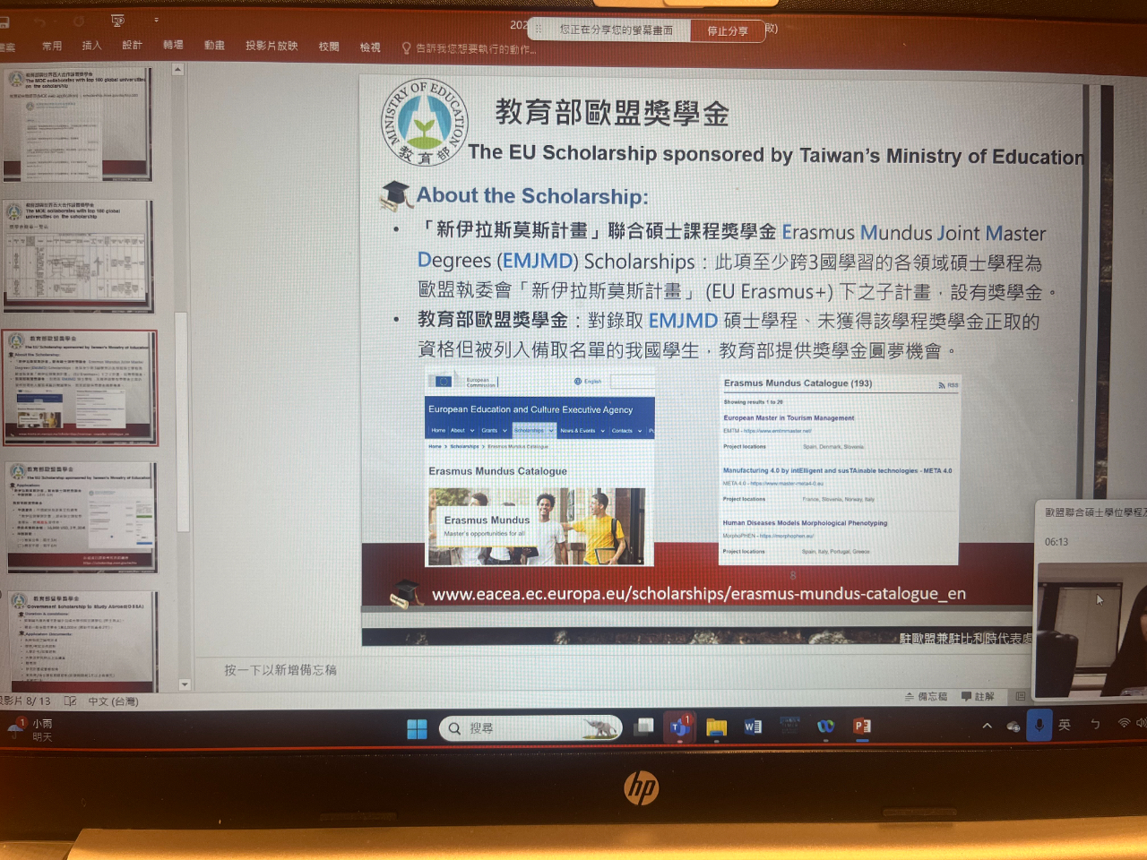 本處於12月16日辦理歐盟聯合碩士學位學程(Erasmus Mundus Joint Master Degree, EMJMD及教育部獎學金說明會。