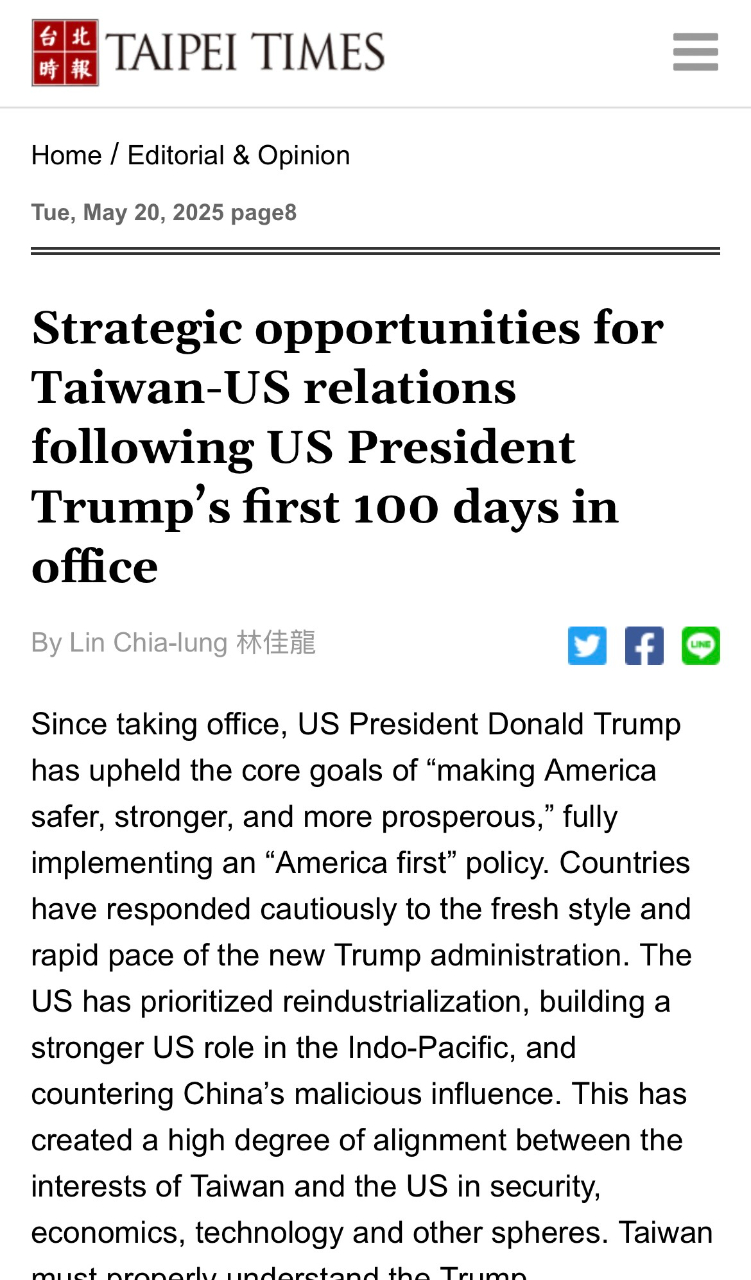 本部林佳龍部長以"Strategic opportunities for Taiwan-US relations following US President Trump’s first 100 days in office"(美國總統川普上任百日後台美關係的戰略機會)為題投書台北時報Taipei Times!!