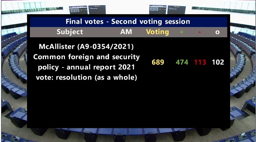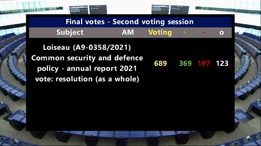 On 17 February, the European Parliament adopted the “Report on the implementation of the Common Foreign and Security Policy” with 474:113:102 and the “Report on the implementation of the Common Security and Defense Policy ” with 369:197:123.