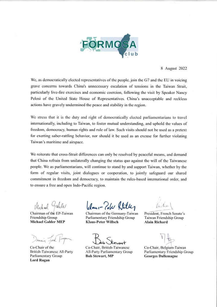 We thank the Formosa Club in Europe for issuing a joint statement, expressing concern over the security in Taiwan Strait.