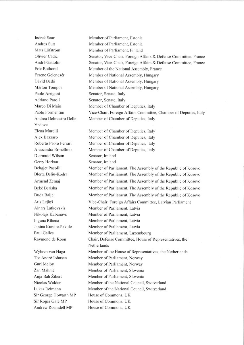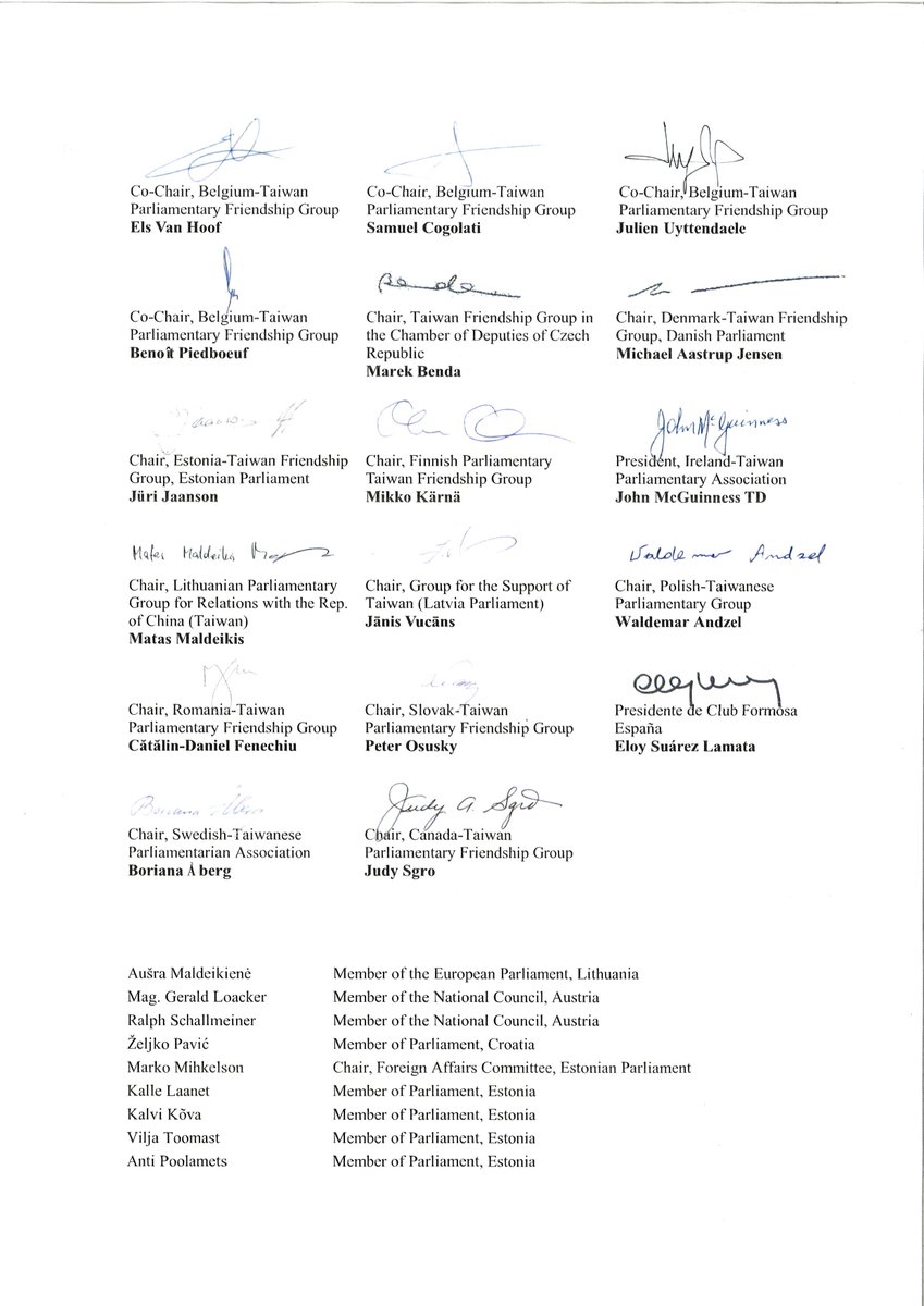 We thank the 79 Members of Parliament of the Formosa Club from 28 parliaments in Europe and Canada for issuing a joint statement, expressing concern over China's military intimidation against Taiwan, which escalates tension and seeks to change the status quo in the Taiwan Strait.