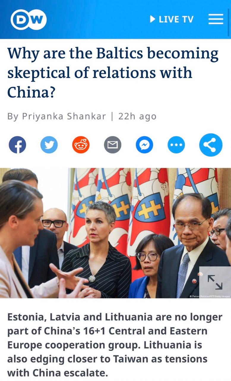 On 22 August, the major international media outlet, Deutsche Welle, reported on Estonia and Latvia's August 11 withdrawal from China's 17+1 mechanism, under the title "Why are the Baltics becoming skeptical of relations with China?".