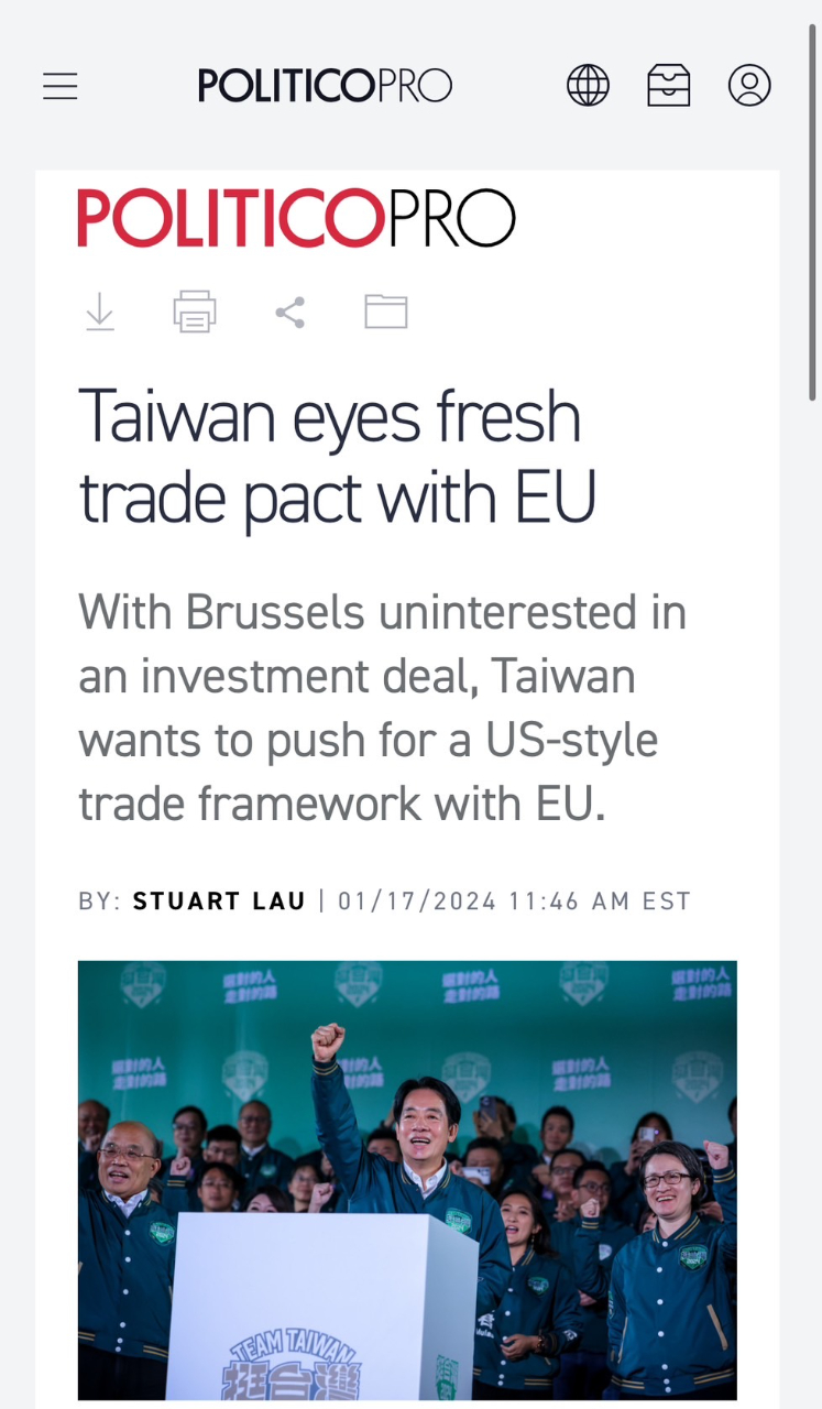 Ambassador Roy  Lee spoke with POLITICO Europe on the potential benefits of exploring a Taiwan-EU trade framework covering tech, green energy, and investments!