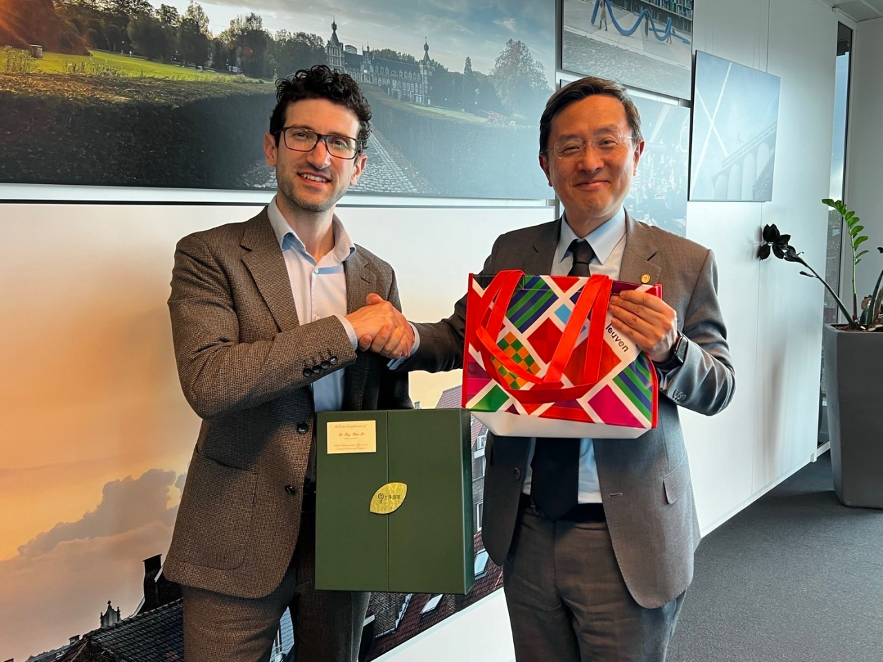 Ambassador Roy Chun Lee met with Leuven Mayor Mohamed Ridouani to promote city exchanges between Taiwan and Belgium