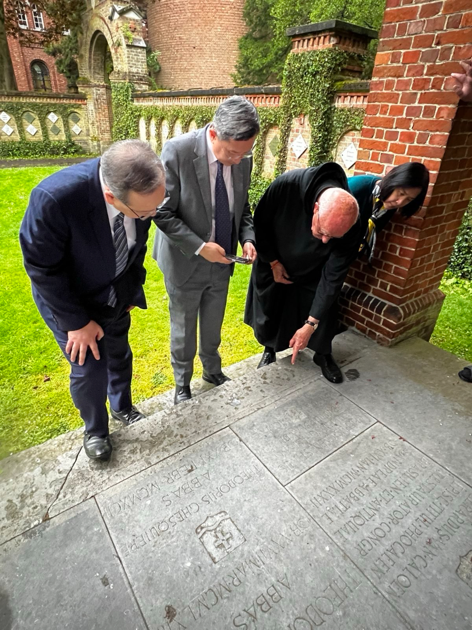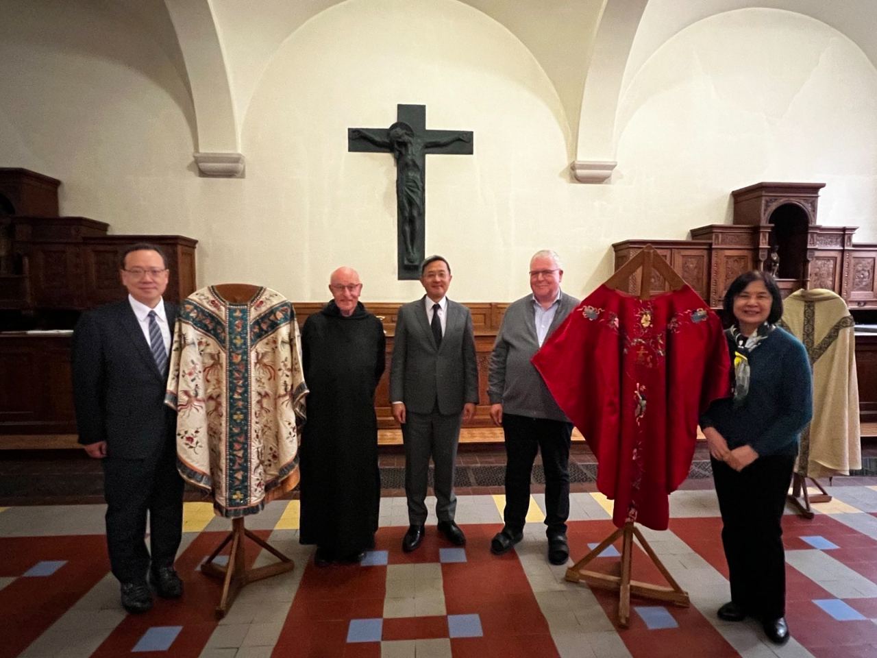 While visiting the world heritage site of Sint Andriesabdij Zevenkerken in Bruges, renowned for its significant role in Belgian and European Catholic history since the early 20th century, as well as for the important part it played in creating a strong bond between the European and Chinese Catholic communities, Ambassador Lee, accompanied by Abbot Dom Léon Van Luchene and Abbot Dom René Fobe, admired the abbey's rich history and environment. He also commemorated Dom Lou's dedication and contributions to the Catholic communities in front of his tomb and belongings.