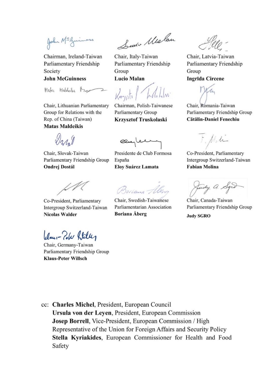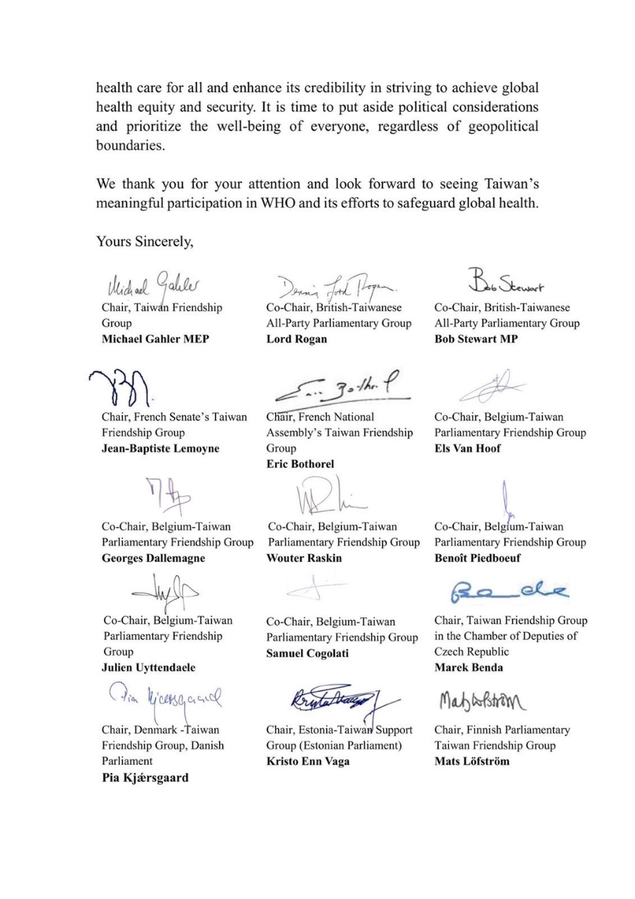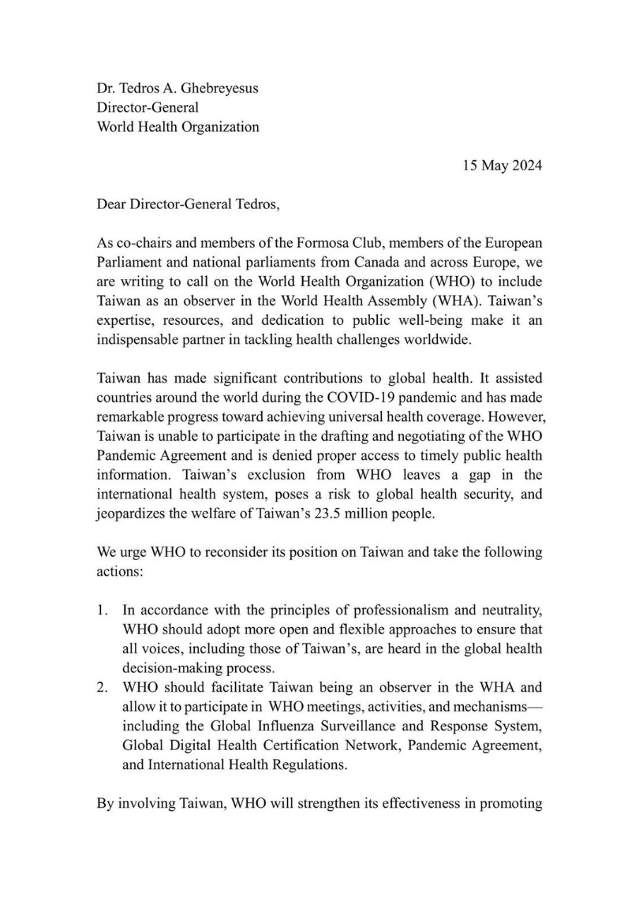 The Formosa Club in Europe, in coordination with the European Parliament and a total of 869 legislators from 27 European countries and Canada, jointly sent a letter to the Director-General of the World Health Organization (WHO), Tedros Adhanom Ghebreyesus, in support of Taiwan's participation as an observer in the World Health Assembly (WHA) scheduled for 27 May to 1 June 2024.