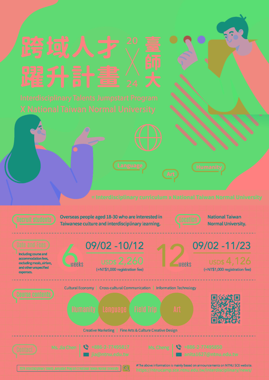 This brand new "2024 Interdisciplinary Talent Advancement Program X NTNU" is specially designed for overseas individuals aged 18-30 who are interested in learning Mandarin Chinese, Taiwanese culture, or interdisciplinary studies. We kindly request your assistance in promoting this valuable learning opportunity to allow more interested people to participate.