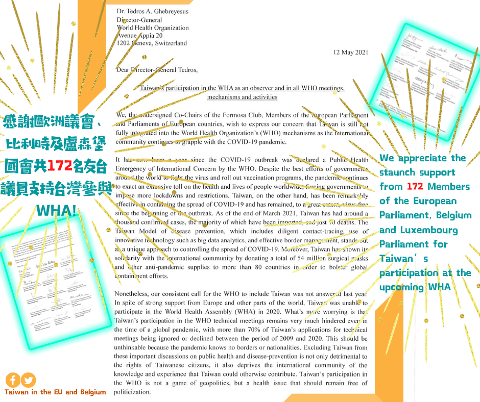 We appreciate the staunch support from the 172 Members of the European Parliament, Belgian and Luxembourg Parliaments that co-signed the joint letter addressed to Dr. Tedros A. Ghebreyesus, Director-General of WHO, urging for Taiwan’s participation as an observer at the upcoming WHA on 24 May. We would like to express our sincere gratitude for the unwavering support coming from Europe. This initiative is an affirmation of Taiwan’s efforts and expertise in pandemic containment, it also shows that calling for Taiwan’s participation in international organizations has become an international consensus. On the path of striving for the opportunity to make concrete contributions to the international community, Taiwan will continue its endeavors.