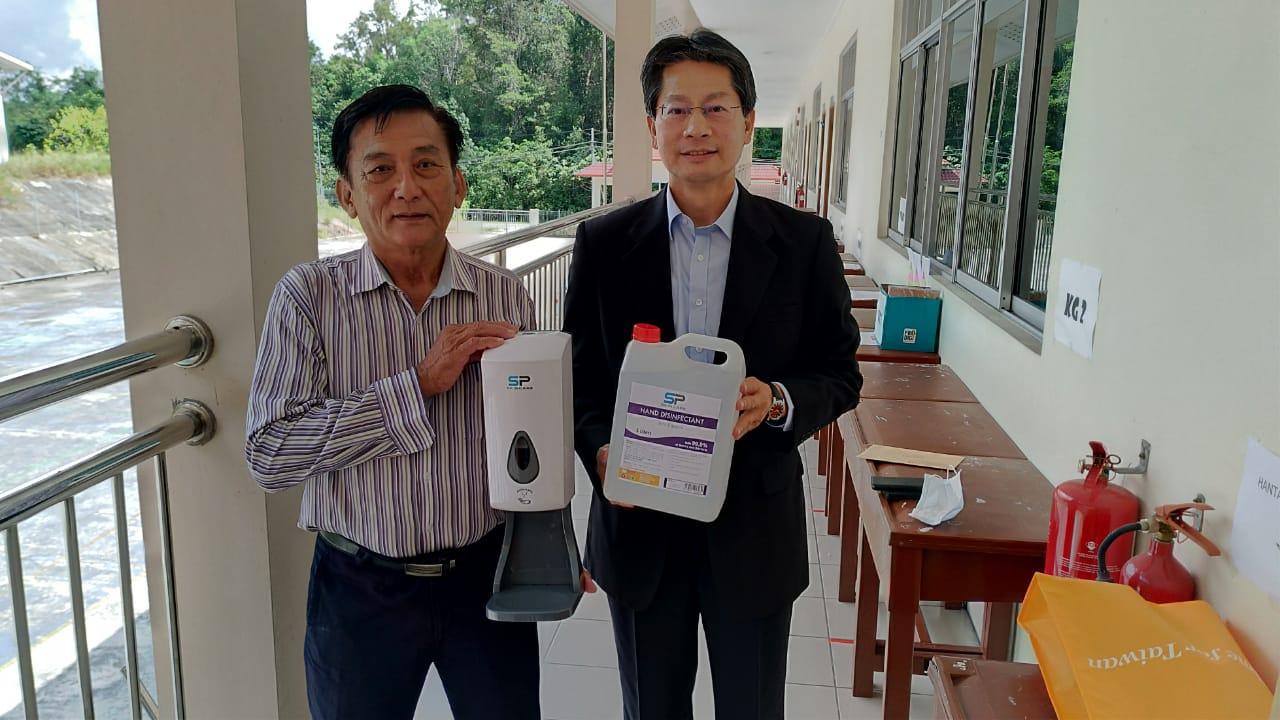 2020.05.15—–本處促成臺灣愛心企業捐贈汶萊華校自動手部消毒機等防疫物資,協助各校防制疫情