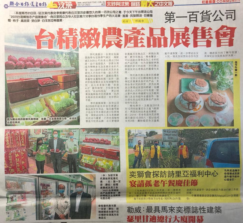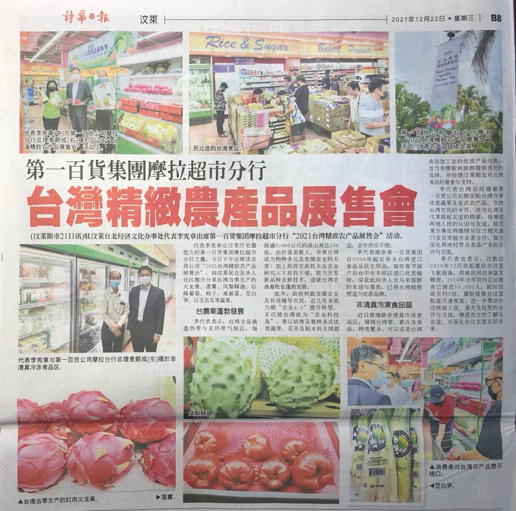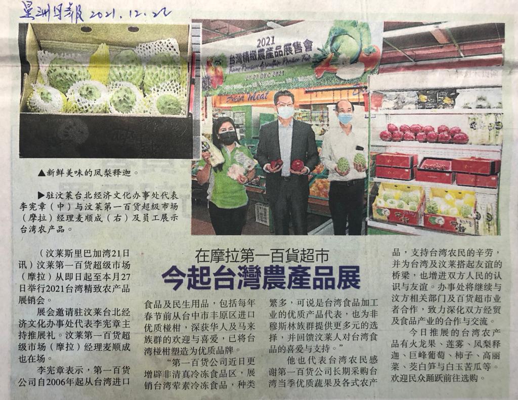 駐汶萊代表處李憲章大使應汶萊歷史最悠久的第一百貨公司之邀,於本(12月21)日下午出席該公司「2021臺灣精緻農產品展售會」,向汶萊民眾及華人社區推介分享臺灣當季生產的火龍果、蓮霧、鳳梨釋迦、巨峰葡萄、柿子、高麗菜、茭白筍、白玉苦瓜等蔬果。