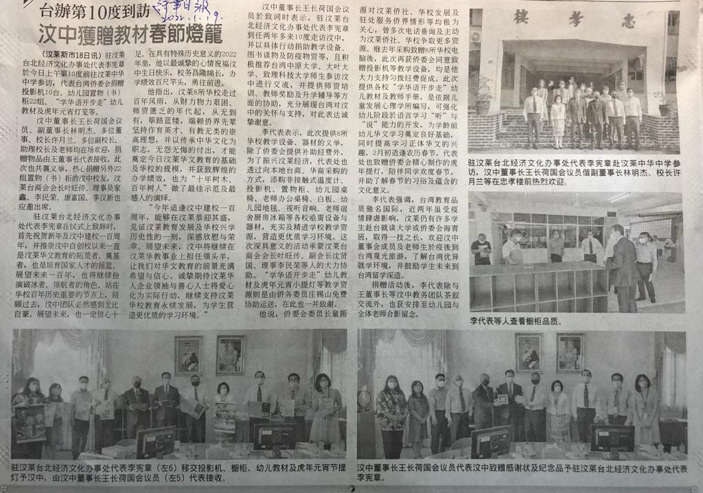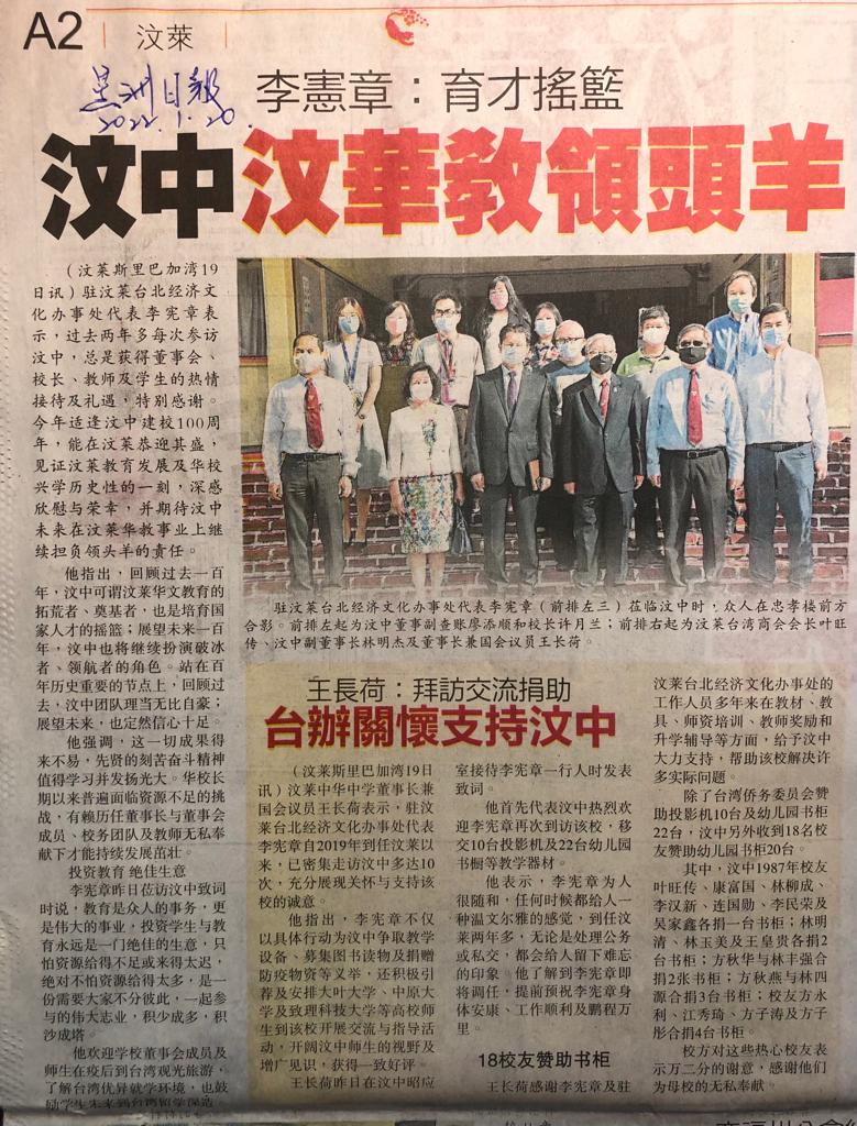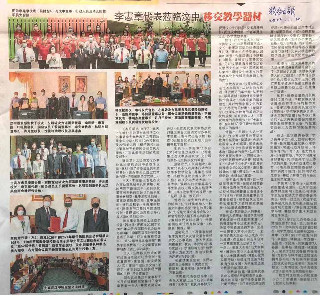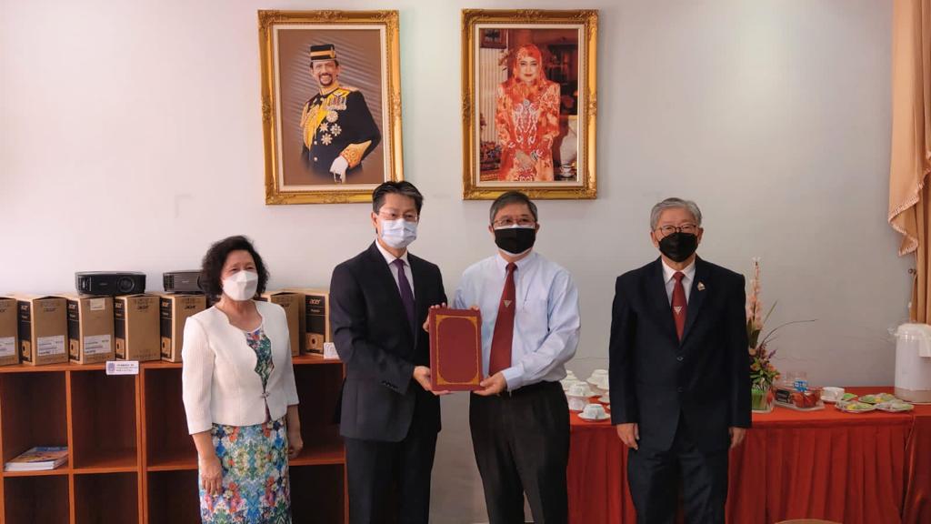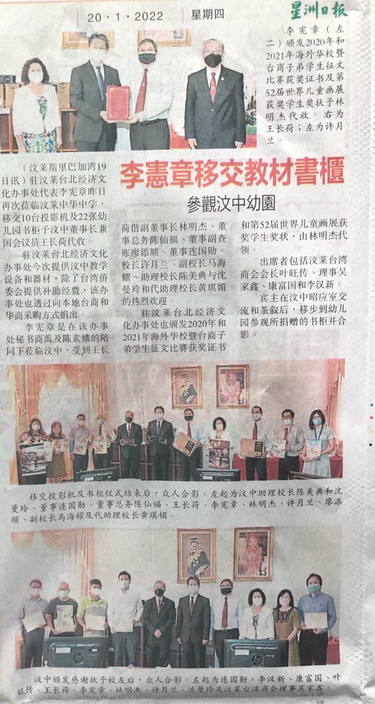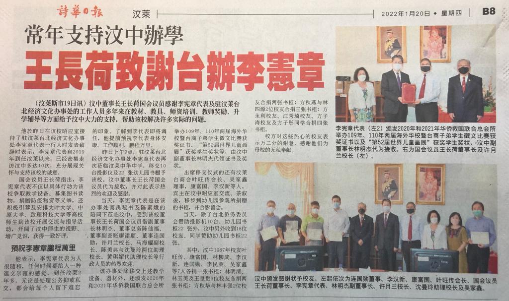 駐汶萊代表處李憲章大使本(1月18)日上午第10度前往汶萊中華中學參訪,代表臺灣僑委會捐贈投影機10台、幼兒園置物(書)櫃22組、「學華語開步走」幼兒教材及虎年元宵提燈等。汶中王董事長長荷、林副董事長明傑、多位董事、許校長月蘭、多位副校長、助理校長及老師均在場歡迎,並由王董事長代表接受。此次也共襄義舉,熱心捐贈另外22組置物(書)櫃的汶中校友,台商會葉旺傳會長、吳家鑫理事、李民榮理事、康富國先生、李漢新也應邀出席。