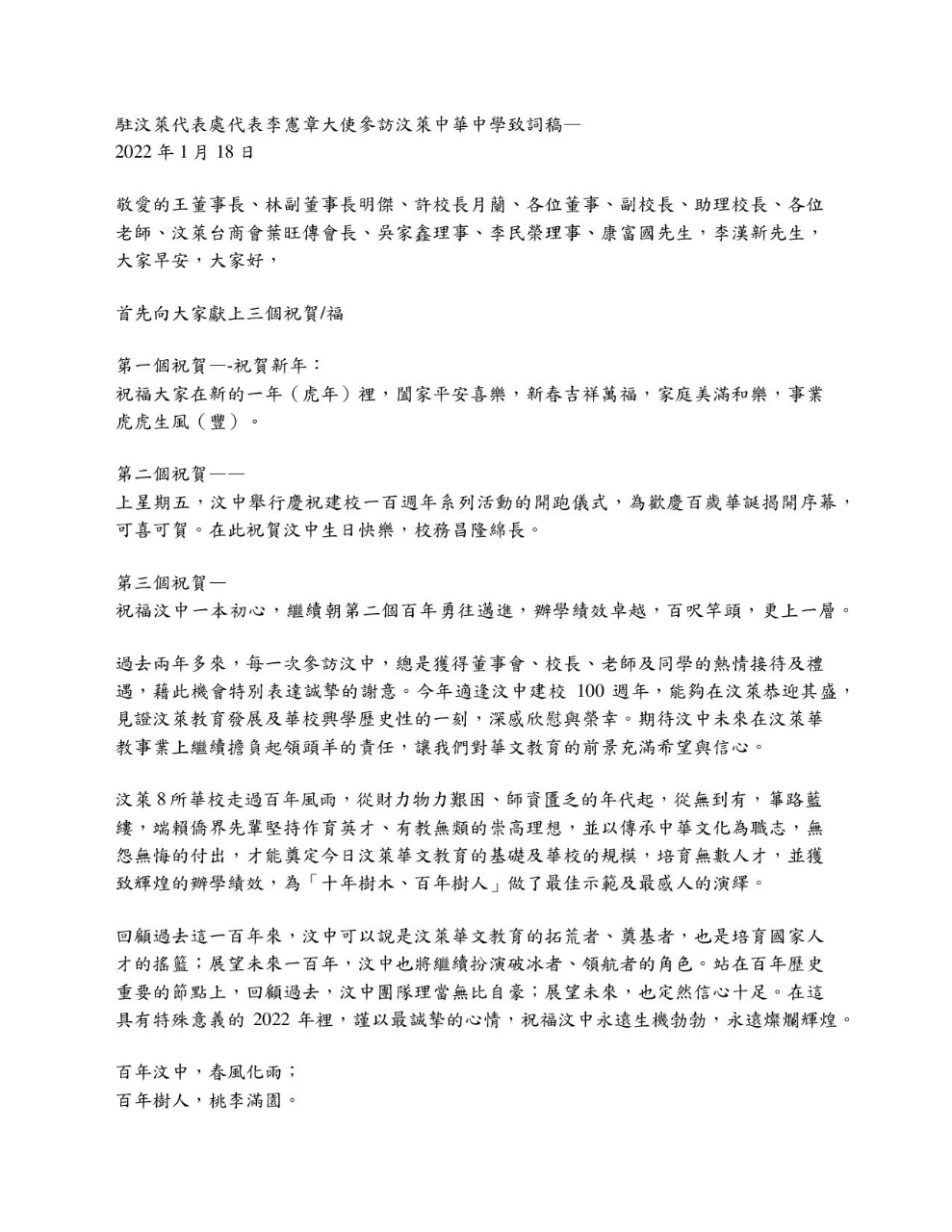李大使首先祝賀新年及汶中建校一百週年,並推崇汶中自創校以來一直是汶萊華文教育的拓荒者、奠基者,也是培育國家人才的搖籃;展望未來一百年,也將繼續扮演破冰者、領航者的角色。站在華校百年歷史重要的節點上,回顧過去,汶中團隊必然感到無比自豪;展望未來,也一定信心十足。在具有特殊歷史意義的2022年裡,謹以最誠摯的心情,祝福汶中生日快樂,校務昌隆綿長;辦學績效百呎竿頭,勇往前進。
