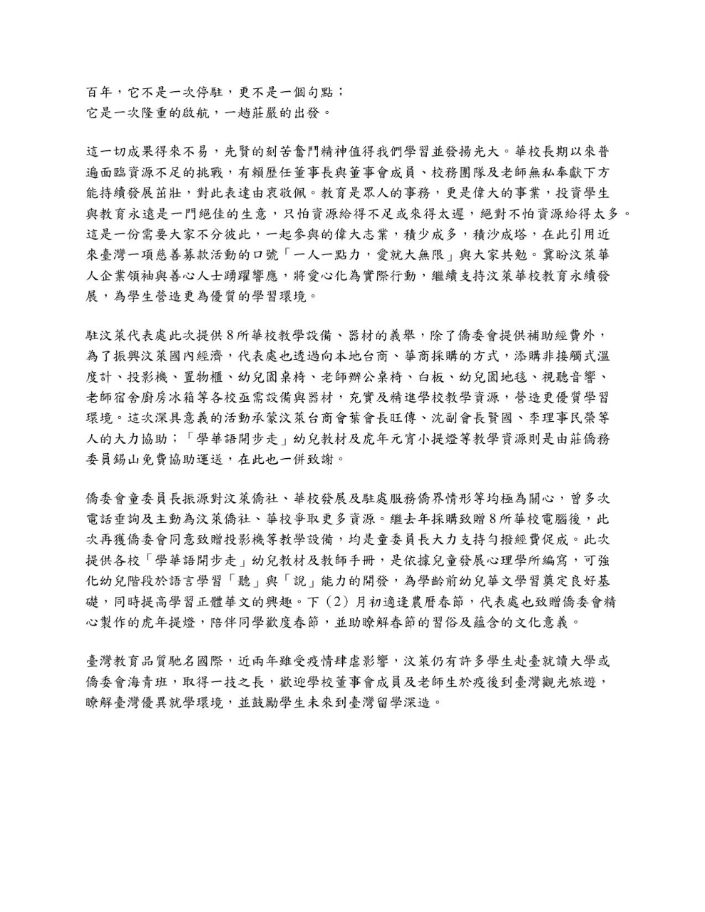 李大使指出,汶萊8所華校走過百年風雨,從財力物力艱困、師資匱乏的年代起,從無到有,篳路藍縷,端賴僑界先輩堅持作育英才、有教無類的崇高理想,並以傳承中華文化為職志,無怨無悔的付出,才能奠定今日汶萊華文教育的基礎及華校的規模,並獲致輝煌的辦學績效,也為「十年樹木、百年樹人」做了最佳示範及最感人的演繹。今年適逢汶中建校一百週年,能夠在汶萊恭迎其盛,見證汶萊教育發展及華校興學歷史性的一刻,深感欣慰與榮幸。展望未來,汶中將繼續在汶萊華教事業上擔任領頭羊,讓我們對華文教育的前景充滿希望與信心。誠摯期待汶萊華人企業領袖與善心人士將愛心化為實際行動,繼續支持汶萊華校教育永續發展,為學生營造更優質的學習環境。