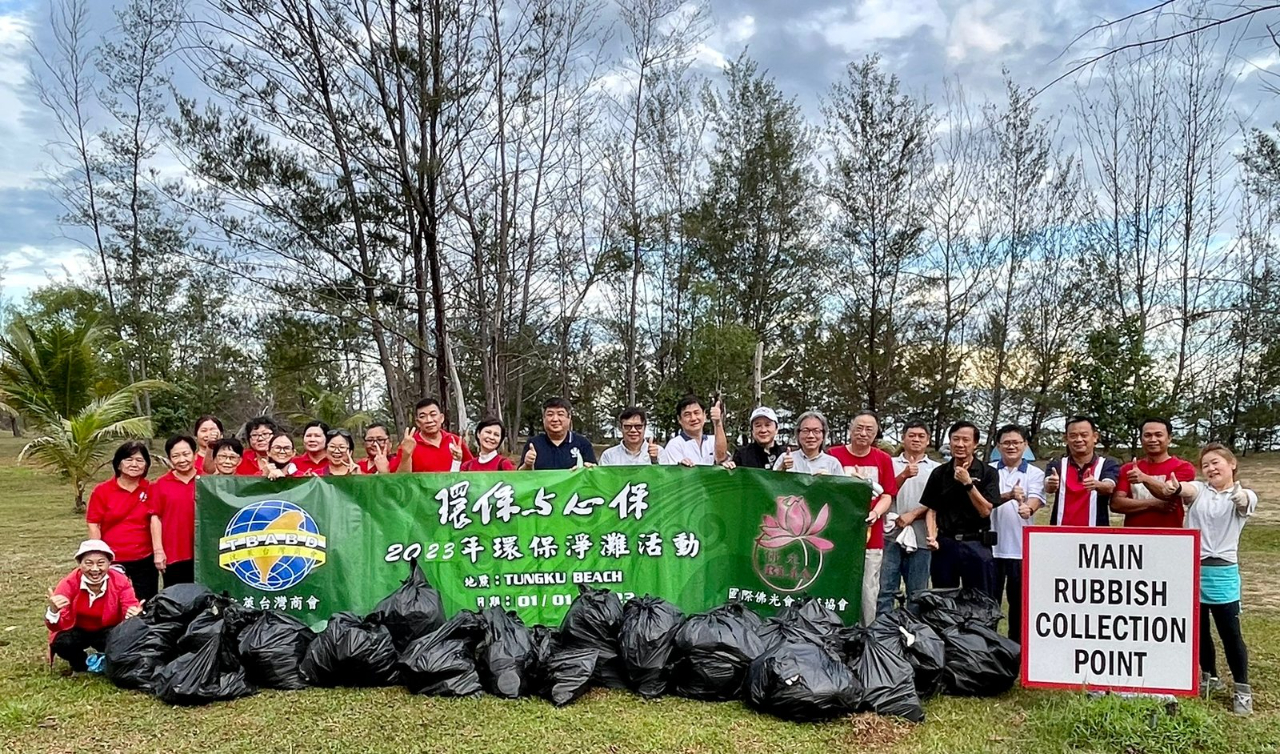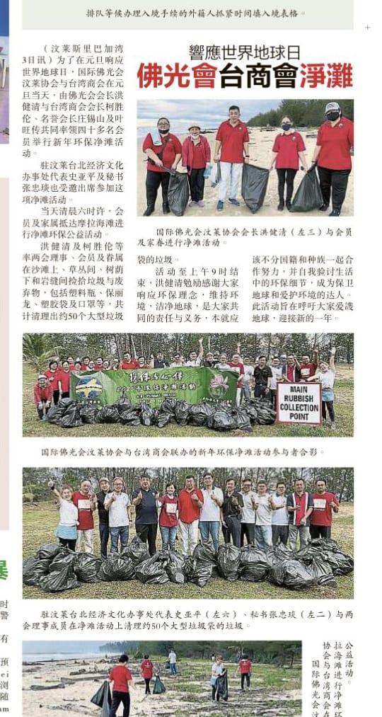 本處史大使亞平偕張副組長忠琰於2023年1月1日清晨 ,參與汶萊佛光會及汶萊台商會在摩拉海灘(Muara Beach) 合辦的新年淨灘活動。