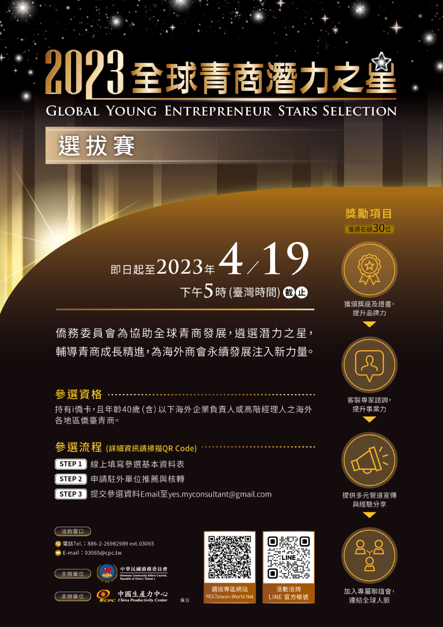 為協助全球青商茁壯發展,對接臺灣與僑界優勢,提升青商發展能量,僑委會辦理2023年全球青商潛力之星選拔賽。