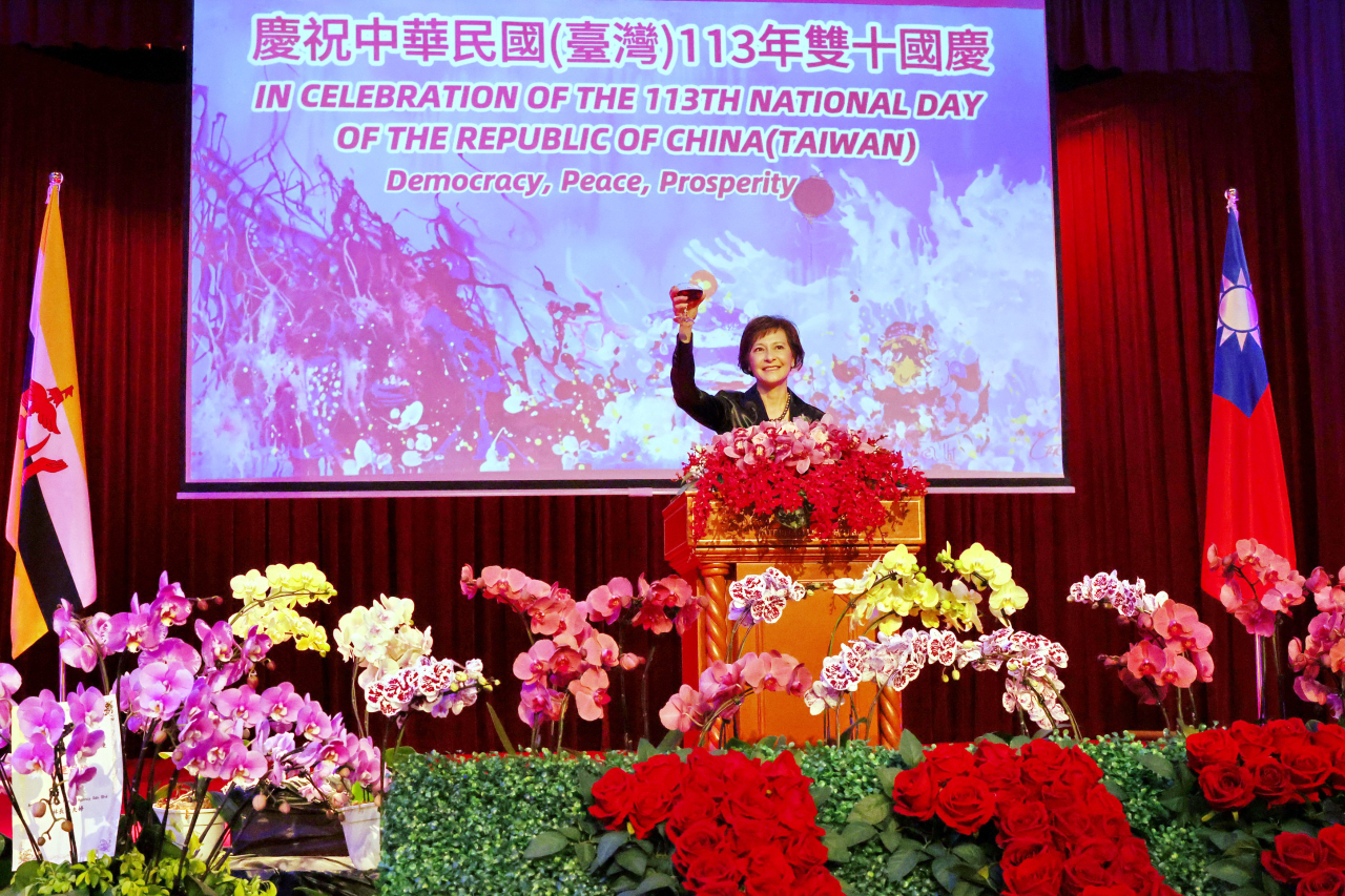 圖一:駐汶萊代表處史大使亞平於本(113)年國慶晚會中致詞並向現場佳賓舉杯祝賀