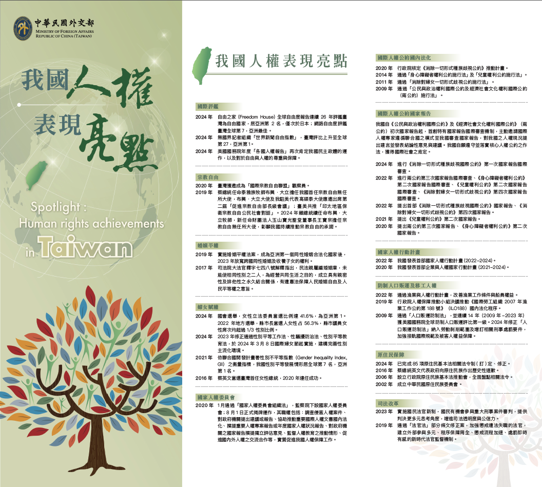 台灣在人權保障方面取得了顯著進展,並獲得國際社會的高度認可。 外交部特別提供「我國人權表現亮點」資訊,詳實呈現我國在人權施政上的最新成果,彰顯台灣致力於落實人權保障並與國際接軌的努力。
