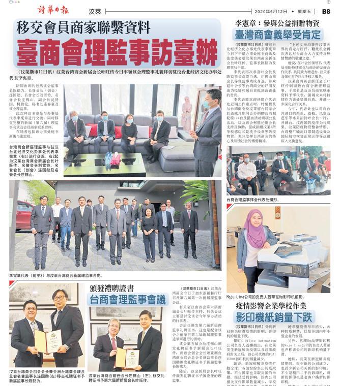李代表致詞簡介代表處近期工作重點時,特別提及與台商會及汶萊留台同學會於齋戒月期間合辦捐贈臺灣製輪椅174台及捐血活動兩項公益活動,以及該會柯勝倫副會長支持及協助,促成捐贈汶萊8所華校感應式乾洗手設備等防疫物資,充分發揮台商會的熱心及回饋社會的博愛精神。上述義舉均獲得汶萊各界的肯定與好評,藉此機會再次表達對台商會大力支持及熱情贊助的敬謝之意。在葉會長領導下,代表處至盼持續深化與台商會的友好合作關係,共同致力增進臺汶關係及強化對僑社與華校之服務。葉會長則面致台商會新任理監事、幹部名錄及會員商家聯繫資料予李代表,強調未來將持續作為本處堅強後盾,並進一步深化合作關係。
