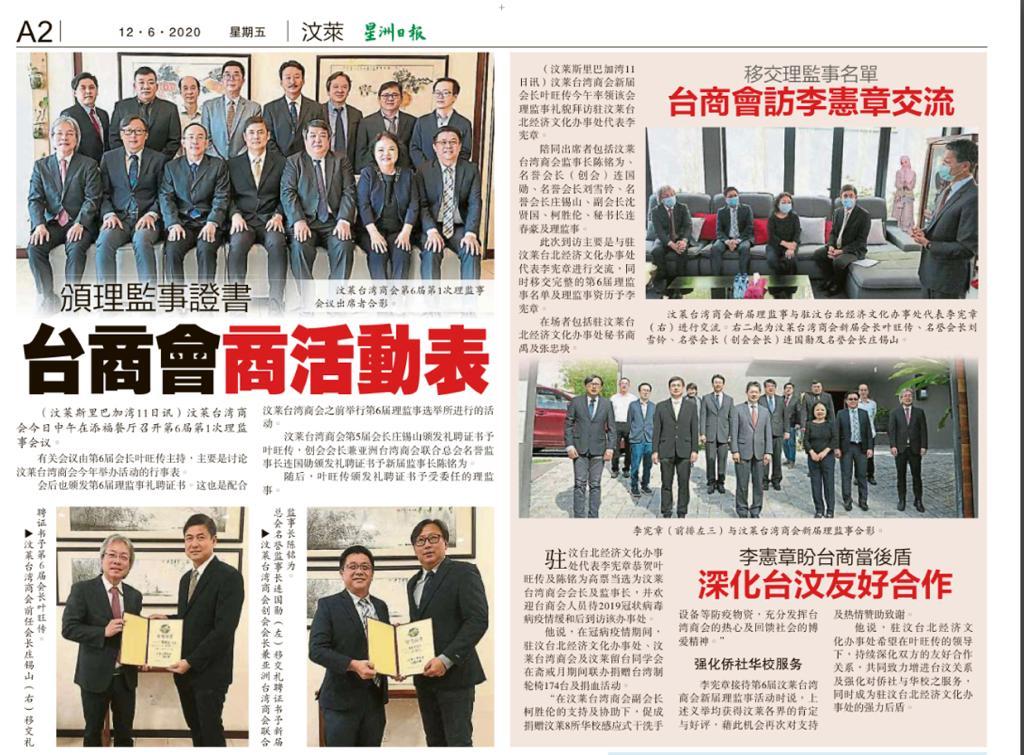 駐汶萊代表處李憲章代表本(6)月11日下午偕商禹及張忠琰兩秘書會晤汶萊台商會新任會長葉旺傳、監事長陳銘為及理事與幹部。李代表再次恭喜葉會長及陳監事長高票當選、莊錫山前會長等幹部功成身退,並歡迎葉會長等台商會的好朋友成為疫情和緩後首批來訪本處的貴賓。