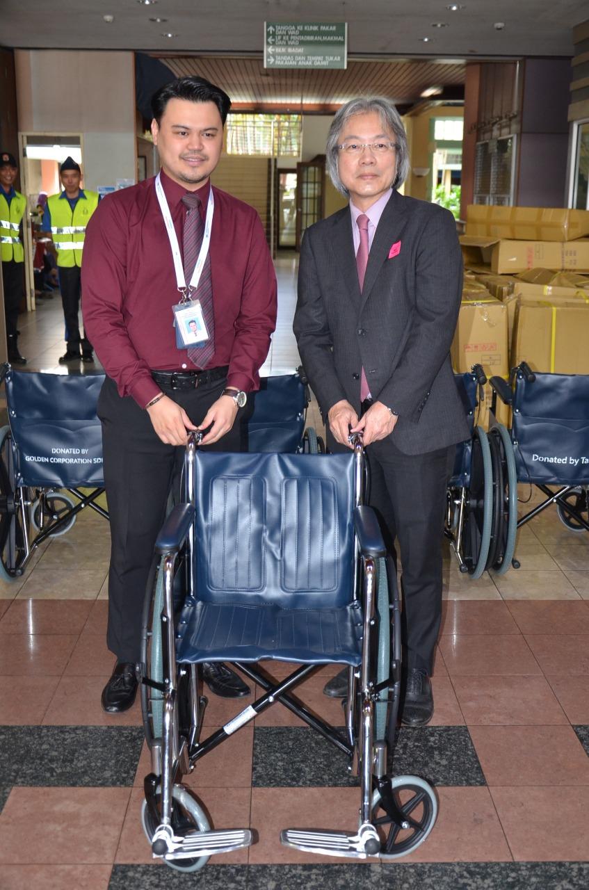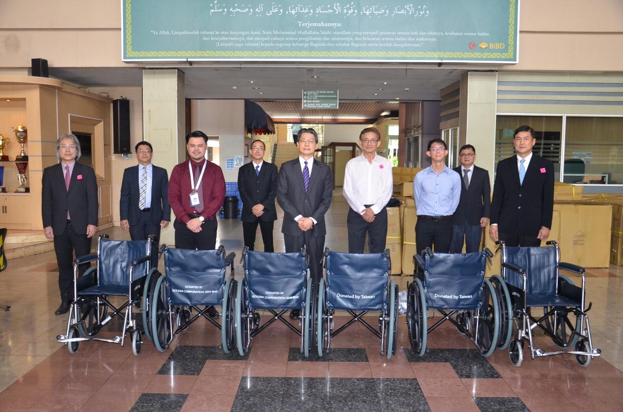繼本(2020)年5月12日捐贈首批輪椅40台予蘇丹后醫院(RIPAS)後,駐汶萊代表處協同汶萊台商會、汶萊留台同學會及在都東縣經營藍蝦養殖及漁捕事業的Golden Corporation(GC)執行董事莊錫山先生(台商會名譽會長),於本(2020)年7月9日上午10時30分,於都東縣(Tutong)「皇太子政府醫院」共同捐贈60台臺灣製造的輪椅予該醫院,由李代表憲章、台商會葉會長旺傳、莊名譽會長錫山及留台同學會謝副主席逸發共同捐贈,並由該醫院執行長(CEO)Abdul Mu’iz Ibrahim代表接受。