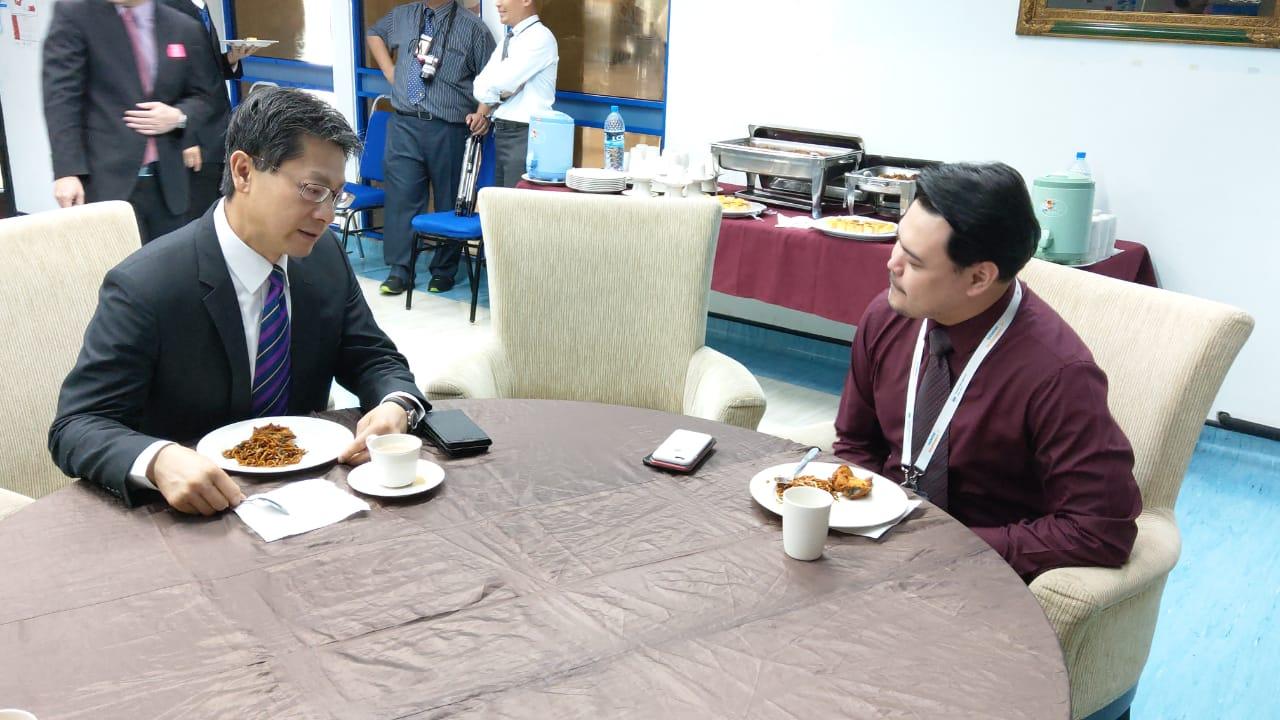 李大使(左)與A執行長(右)於捐贈儀式後茶敘中,就臺汶兩國疫情管控成效,以及未來加強雙邊醫衛合作及交流等交換意見