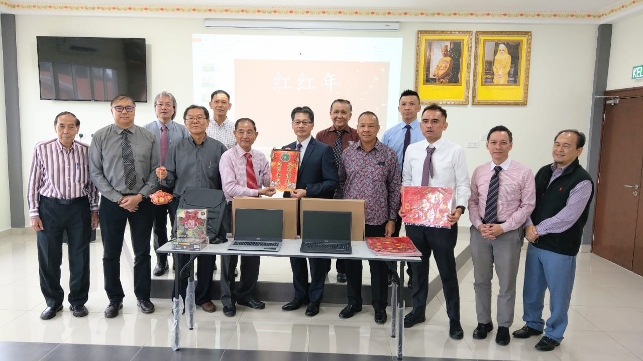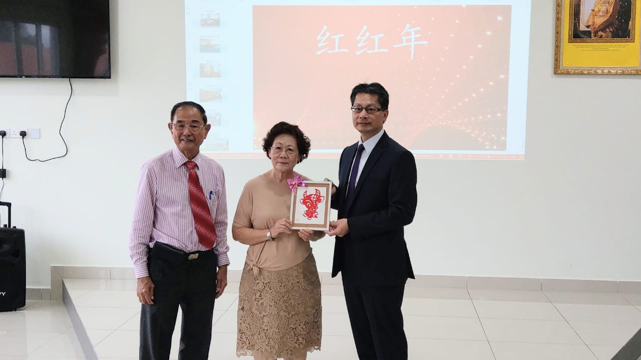 李代表首先感謝孫董事長等人的熱情接待,並祝賀孫董事長蟬聯都東學校董事長,以及新任董事會就職,為都東學校的壯大與發展繼續努力。祝福董事會在辛丑牛年裡,得心應手,牛轉乾坤;也祝賀董事會、全校師生新春闔家平安,都東學校校務昌隆。李代表即代表僑委會捐贈電腦設備及相關教材,並轉達童振源委員長對汶萊華校的關懷及致賀新年;並表示,此次致贈8所華校的電腦均為童委員長大力支持勻撥經費促成,牛年燈籠亦為僑委會提供,希望有助汶萊華校學童認識傳統農曆春節的意涵,並陪伴小朋友度過難忘的春節假期,也能學習牛的努力勤奮與踏實耕耘的精神。