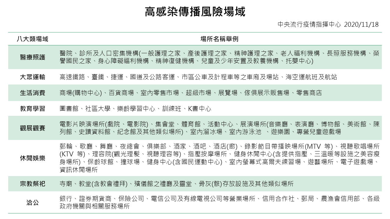 指揮中心表示,考量秋冬時期除了COVID-19疫情外,也有多種呼吸道傳染病盛行,都會加重醫療體系的負荷與調度壓力,為了提高民眾於高感染傳播風險場所佩戴口罩的遵循度,以降低呼吸道傳染病的感染與傳播,及避免過度耗用醫療資源,自12月1日起,強制要求民眾進入「醫療照護、大眾運輸、生活消費、教育學習、觀展觀賽、休閒娛樂、宗教祭祀、洽公」等八大類場所(場所舉例如附表)應佩戴口罩。未依規定佩戴口罩,經勸導不聽者,將依違反傳染病防治法第37條第1項第6款規定,由地方政府裁罰新臺幣3千元以上1萬5千元以下罰鍰。