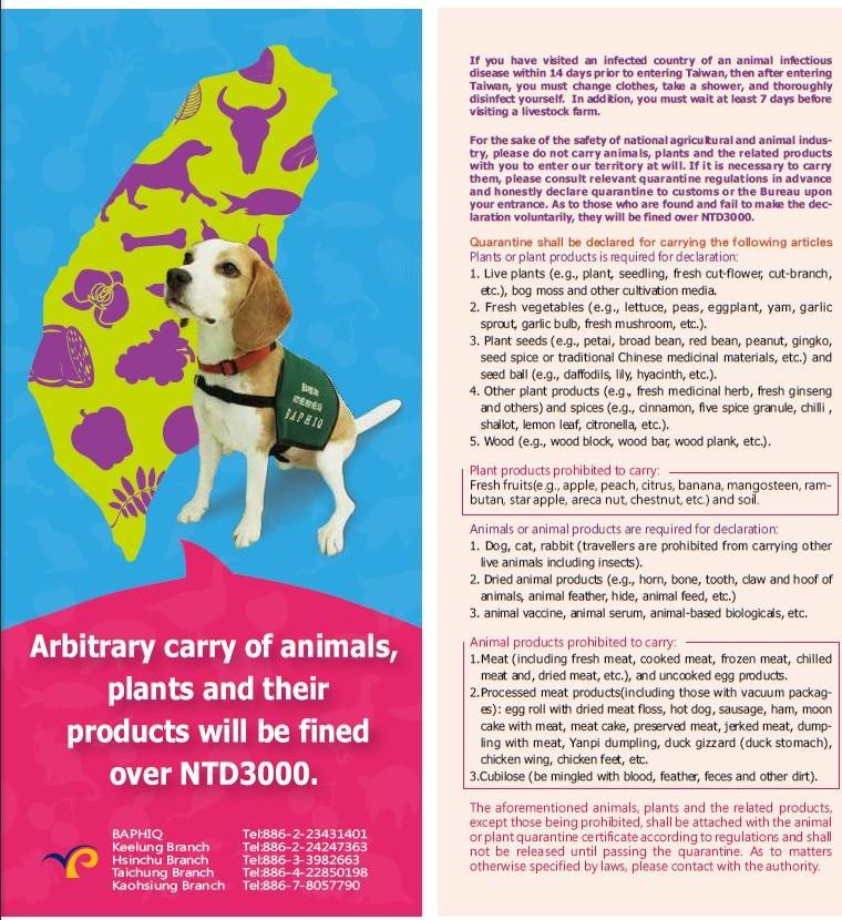 A fim de conter o alastramento da peste suína africana, todos os visitantes não devem transportar animais, plantas e produtos relacionados à vontade quando entrarem em Taiwan