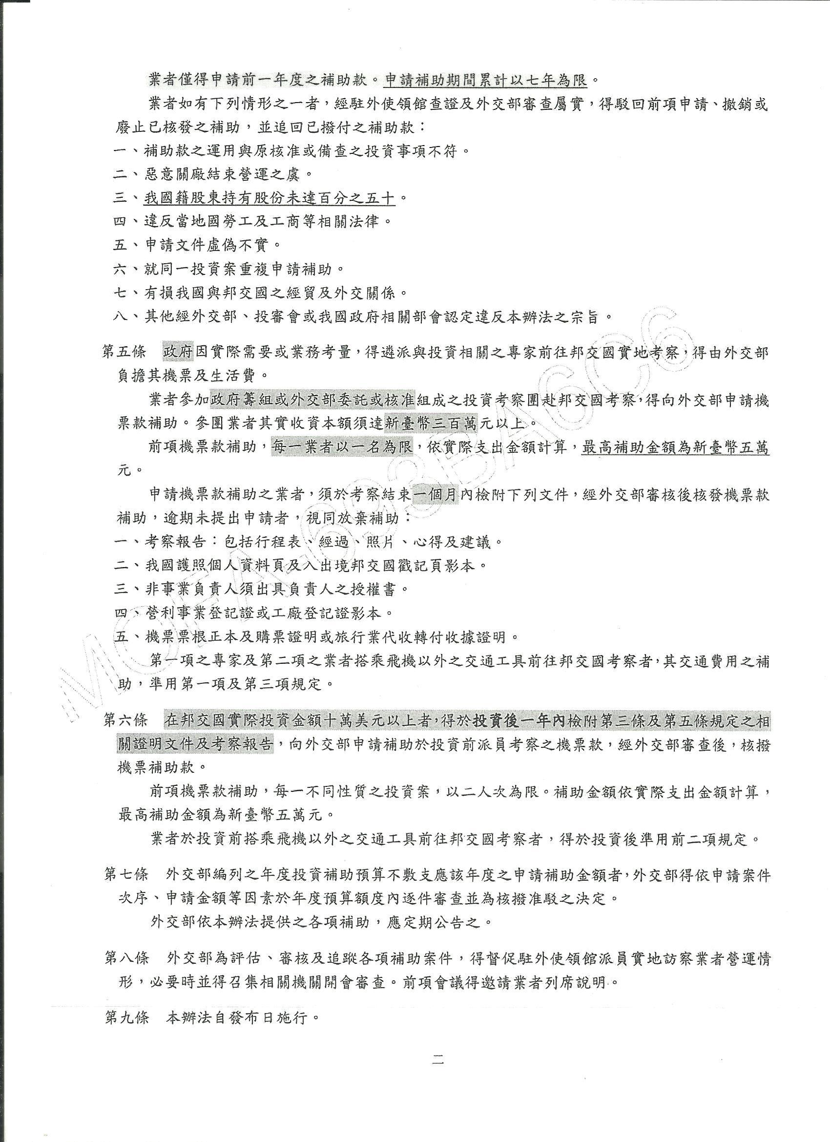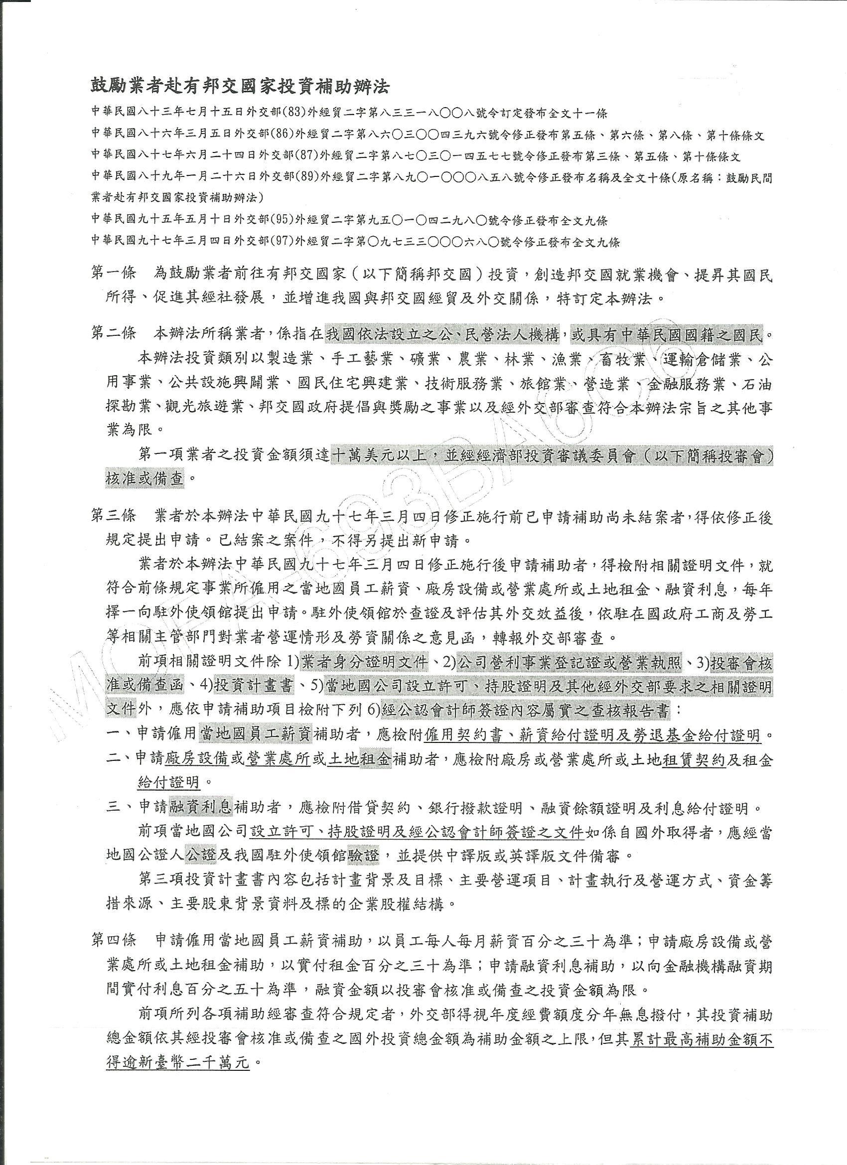 本年度外交部「鼓勵業者赴有邦交國家投資補助辦法」(請詳附件補助辦法條文)核撥,擬採「先申請,先審核」之方式辦理,為保留案件審核作業時間,請有意申請之廠商,務必於本(105)年10月31日前備齊相關文件並填妥申請表遞交申請,逾期恕不受理。本案詳情、補助申請表及所需文件,請致電本館索取。