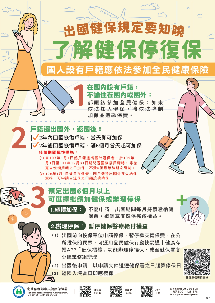 根據台灣衛福部健保署「全民健康保險」相關規定,為保障健保權益,在台灣有戶籍的鄉親要記得參加健保,並且繳納保費;出國期間可辦理停保,如果未辦停保仍應持續繳保費。各位鄉親如有疑問,請洽健保署諮詢專線0800-030-598;手機請撥02-4128-678