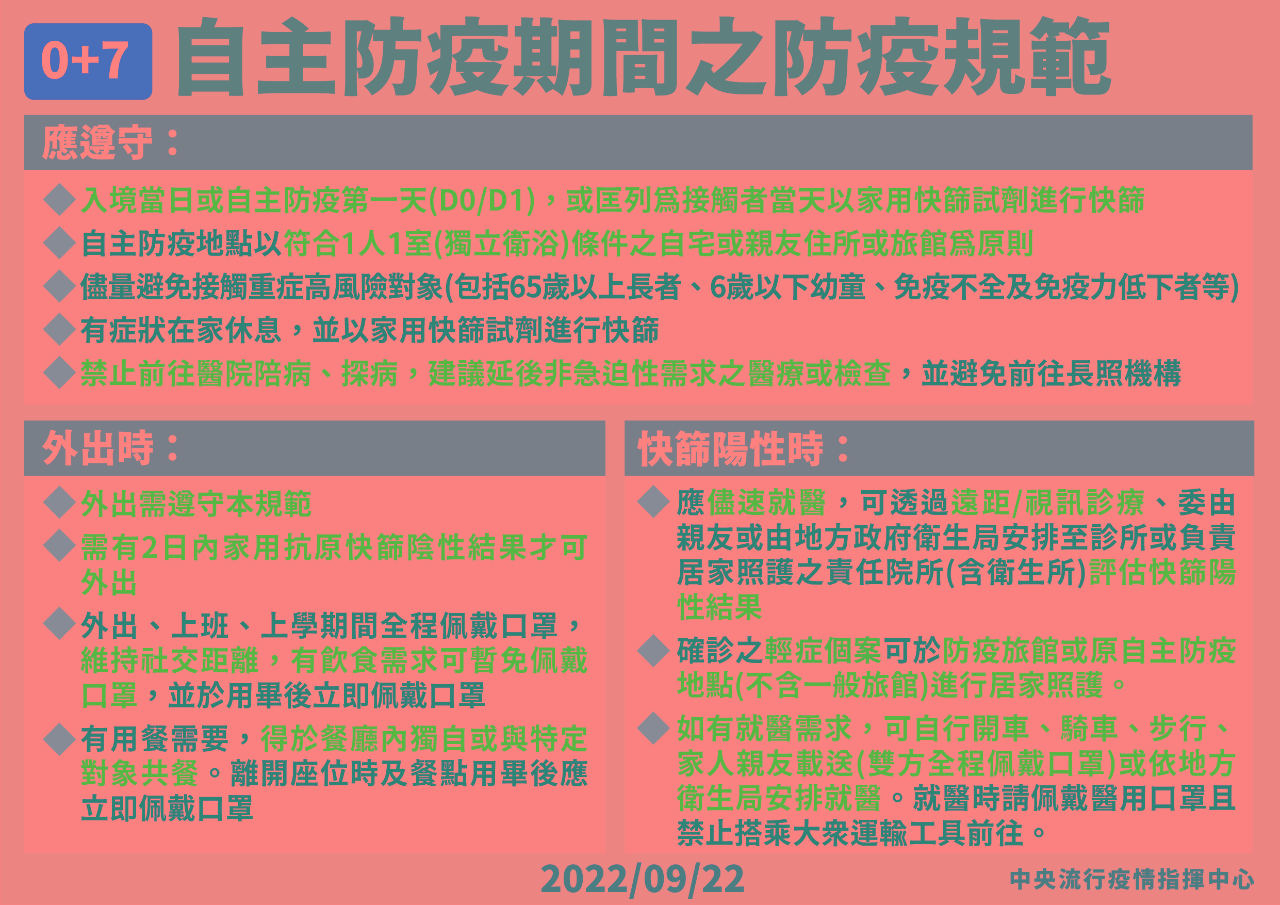 中央流行疫情指揮中心(CECC)宣布,預計2022年10月13日零時起實施「0+7」防疫新制,從國外入境台灣不再需要居家檢疫,但仍然必須進行「7天自主防疫」,相關細節請參考以下圖卡。