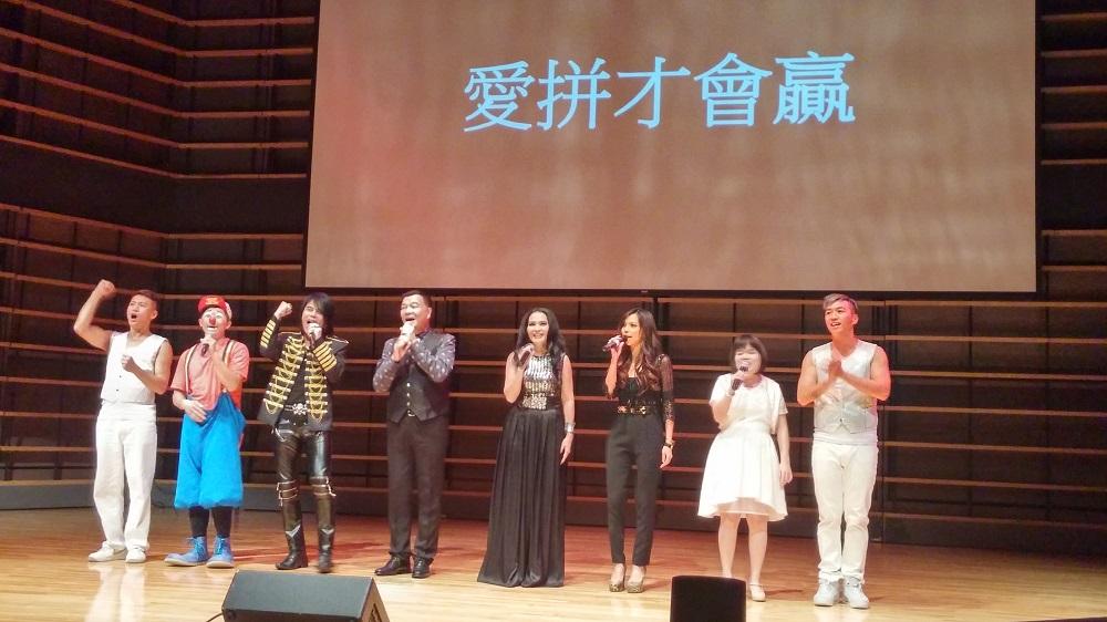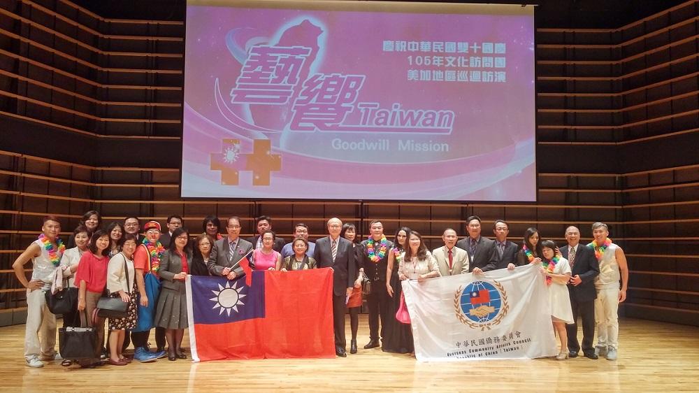 美加地區國慶文化訪問團是晚演出甚具特色,包括由視障歌手蕭湘婷小姐以清晰響亮歌聲分別高唱國、台、粵語歌曲,及上(104)年在美國參加小丑大賽榮獲大賞獎的周子汧先生,表演其得獎作品「立方體」,另外潘越雲小姐、李明德先生的民歌精選及簡語卉小姐、黃上先生的模仿演唱表演均獲得好評。全場演出80分鐘一氣呵成,全場觀眾報以熱烈掌聲。表演結束後,龔大使及貴賓與該團全體團員上台合影。