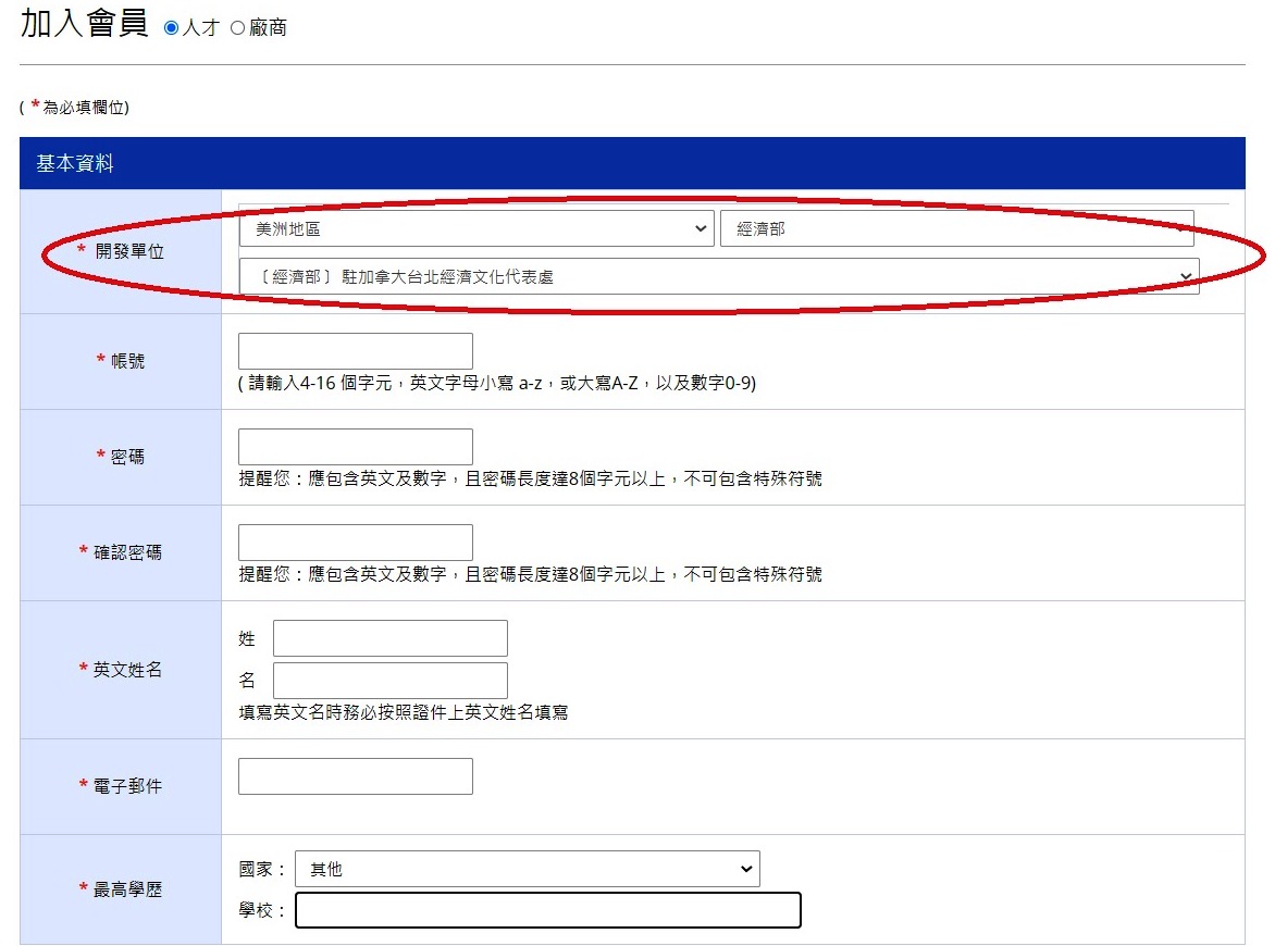 為使會員登錄程序更加簡便,經濟部進一步改版簡化Contact TAIWAN攬才平台之會員註冊登錄頁面,期使海外人才可更簡易註冊成為會員並充分運用平台之免費資源。謹檢送改版後之會員登錄頁面資訊連結:https://www.contacttaiwan.tw/member/registMemberStep2.aspx;其中「開發單位」欄位部分,請協助依序選填:美洲地區->經濟部->[經濟部]駐加拿大台北經濟文化代表處(詳情如下圖所示)。