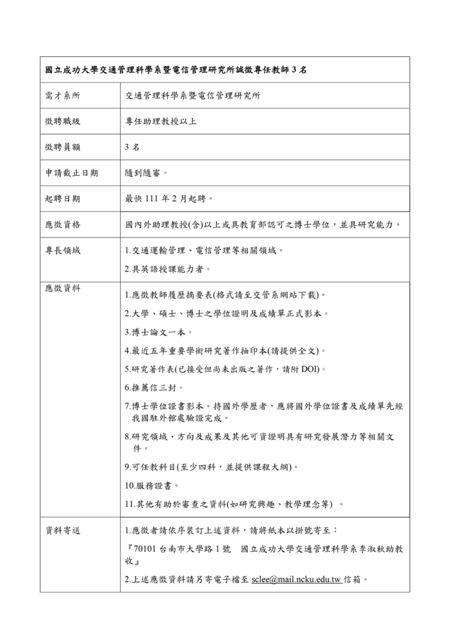 110上成功大學交通管理科學系暨電信管理研究所徵聘師資公告