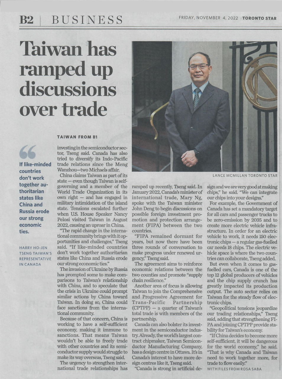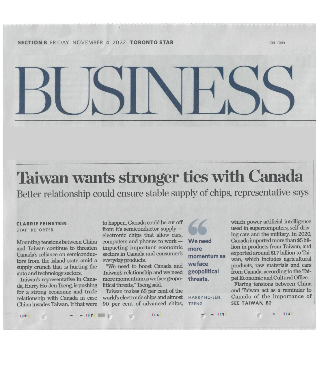 「多倫多星報」本(11)月4日於經貿版首頁與網路版以「台灣駐加代表呼籲強化台加關係,確保穩定的晶片供應 ( Taiwan wants stronger ties with Canada. Better relationship could ensure stable supply of chips, representative says.) 為題,內容橫跨紙本二大版大篇幅刊出專訪內容。