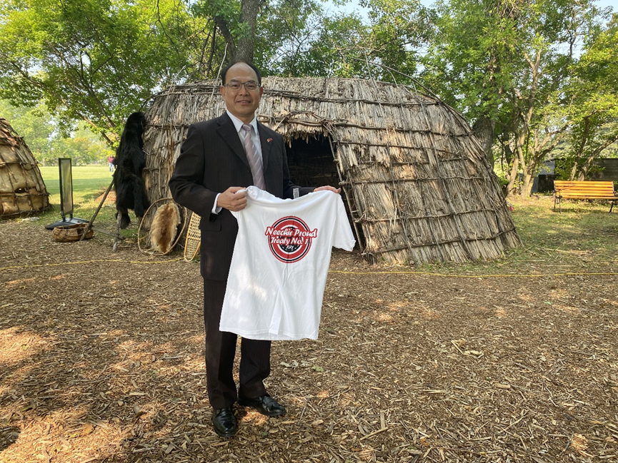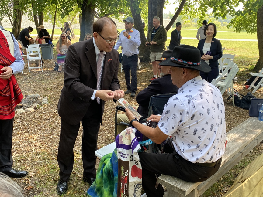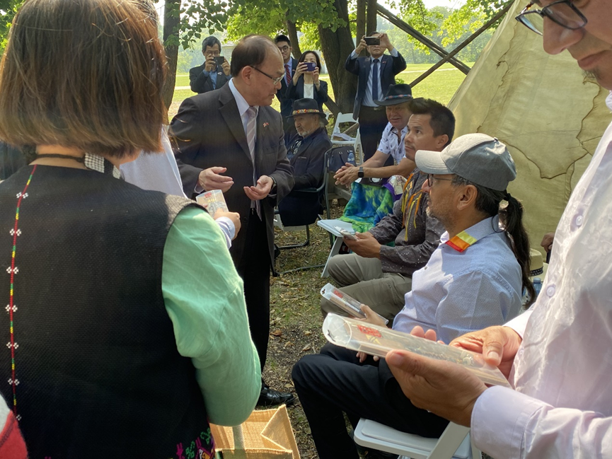 曾大使於致詞表示,相當榮幸訪問緬省,推動台加原民經貿合作與文化交流,原住民歷史與教育在台灣與加拿大皆是重要議題,認同第一民族對歷史真相的追求是邁向民族和解之重要一步。第一民族酋長代表歡迎曾大使率團前來交流,並表達支持台加深化自由貿易與簽署經貿合作協議的立場,希望與台灣合作推動原住民經濟賦權。