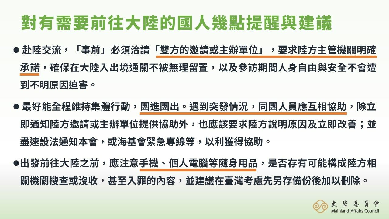 因應國際局勢變化,為減少僑民赴中國、香港及澳門地區(含轉機)可能遭遇之風險,請參考大陸委員會網站,詳閱相關提醒事項。