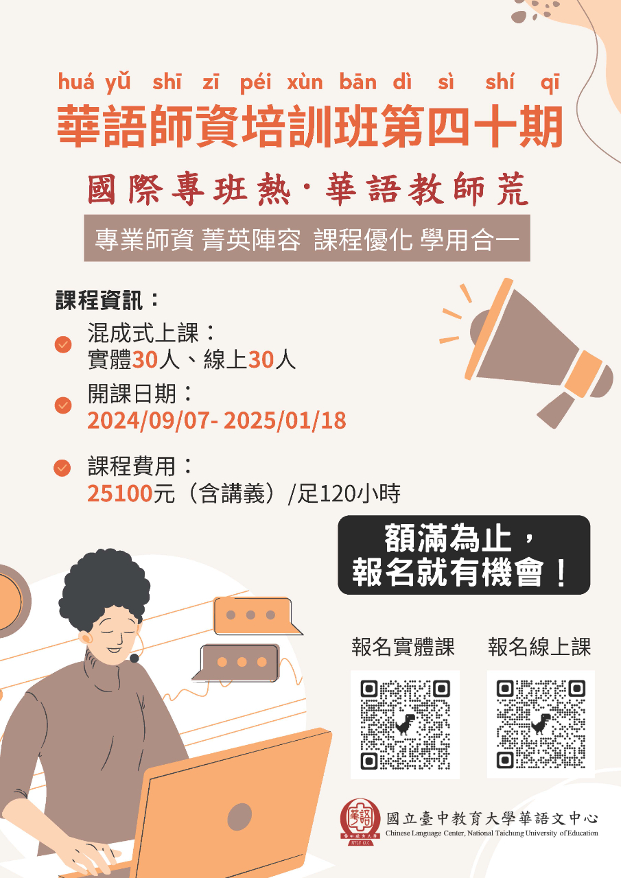 台中教育大學進修推廣部華語文中心開設「第40期華語師資培訓班-混成式上課」