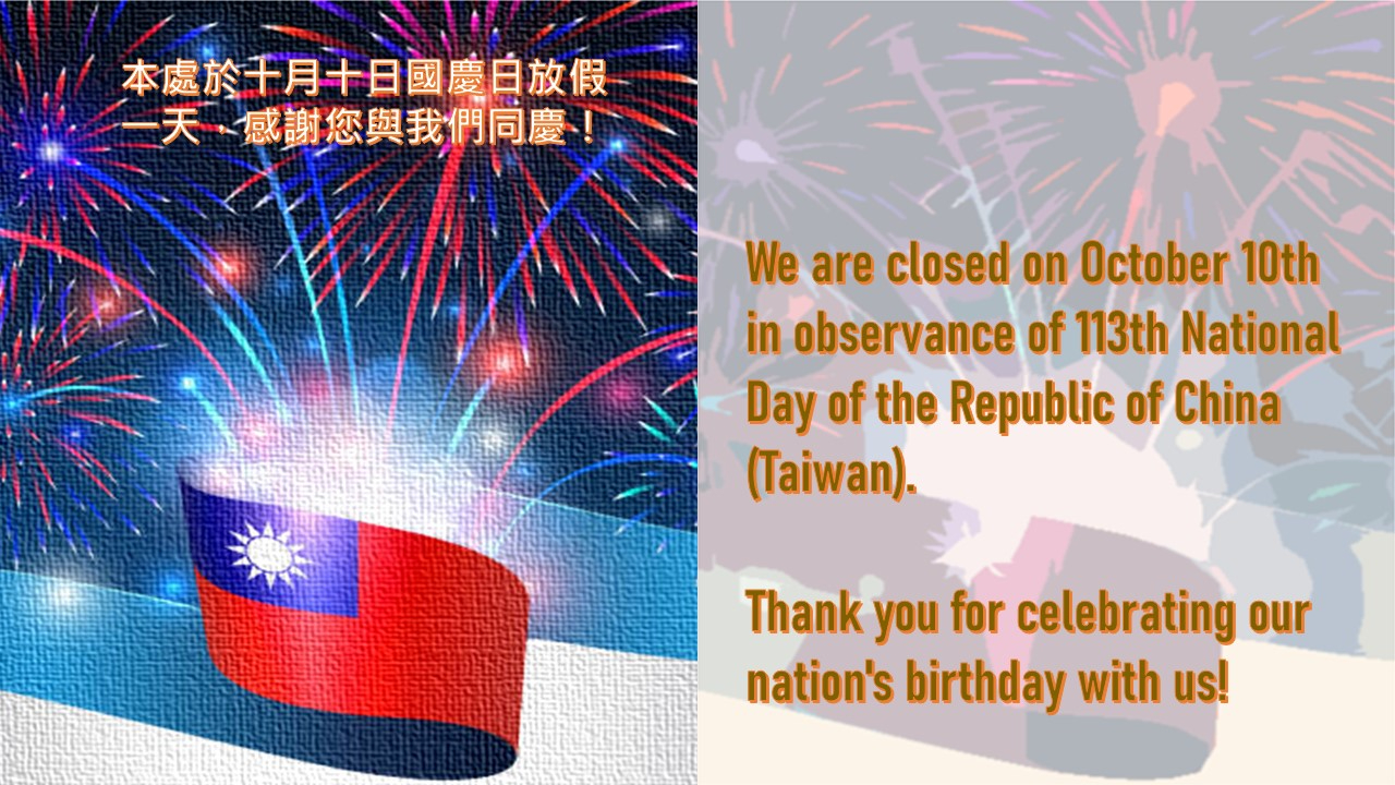 本處於十月十日中華民國113年國慶日放假一天 - 駐加拿大台北經濟文化代表處 Taipei Economic and Cultural Office in Canada ::: 跳到主要內容區塊