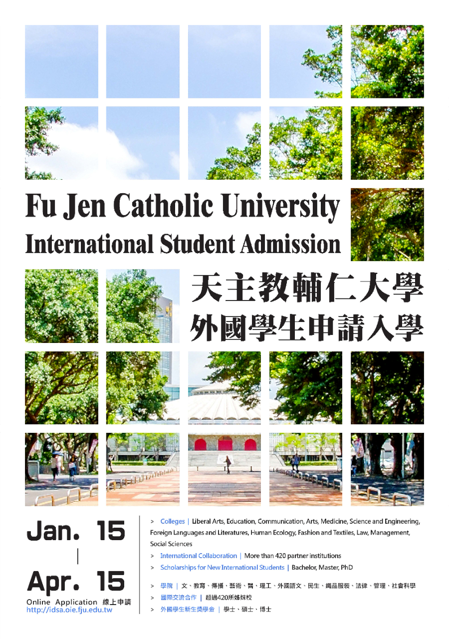 Fu Jen Catholic University is a comprehensive university founded by the Holy See. Originally established in Beijing in 1925, Fu Jen was re-established in Taiwan in 1961. With a history spanning 95 years, the university currently has 12 colleges/schools, 50 undergraduate programs, 49 master’s programs, and 12 PhD programs. Please refer to the Academic Units for more information.