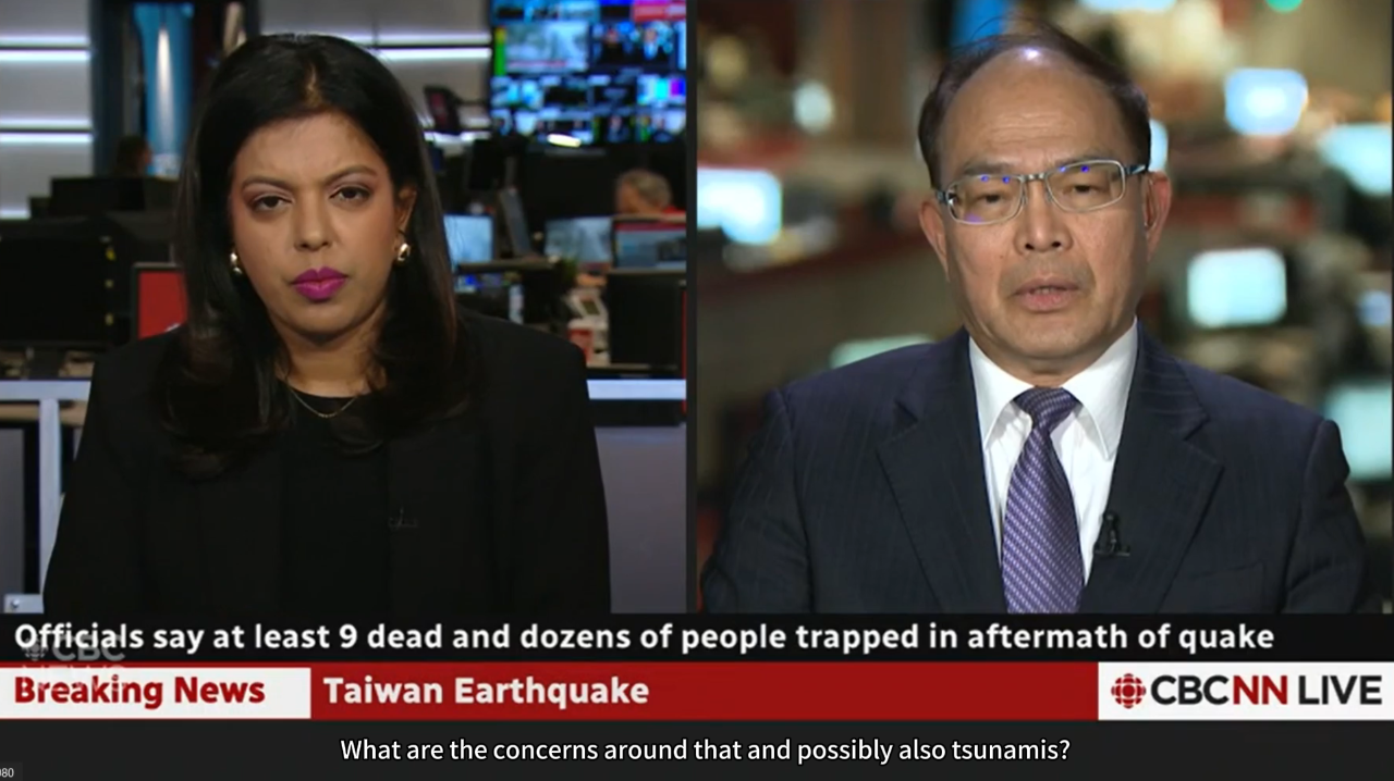 Following the broadcast of footage of the earthquake in Taiwan and on-site reports by journalists on April 3, the Canadian Broadcasting Corporation (CBC) invited Ambassador Tseng Ho-jen, our country's ambassador to Canada, to respond. Ambassador Tseng explained that after the earthquake occurred in the early morning in Taiwan, more than 200 aftershocks have occurred successively, some with a magnitude exceeding 6, and frequent aftershocks are expected in the coming days. Ambassador Tseng also mentioned that the earthquake caused collapses and falling rocks in many places in Hualien, leading to many people still being trapped in disaster areas. Our government is exerting full efforts in search and rescue operations. He also explained that both the government and private sector are fully engaged in disaster relief work, and at this stage, it has not been decided whether to seek international assistance, including from Canada. He mentioned that one male and one female Canadian tourists were stranded in the mountains after the earthquake, but fortunately, both have been rescued and are safe. Ambassador Tseng also expressed special thanks to Prime Minister Trudeau and Foreign Minister Mélanie Joly of Canada for expressing sincere condolences on the Taiwan earthquake disaster situation at the earliest opportunity and offering necessary assistance.