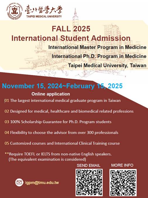 International Master/Ph.D. Program in Medicine (Attached guidelines) : https://medicine-en.tmu.edu.tw/research/departments/international-master-ph-d-program-in-medicine/