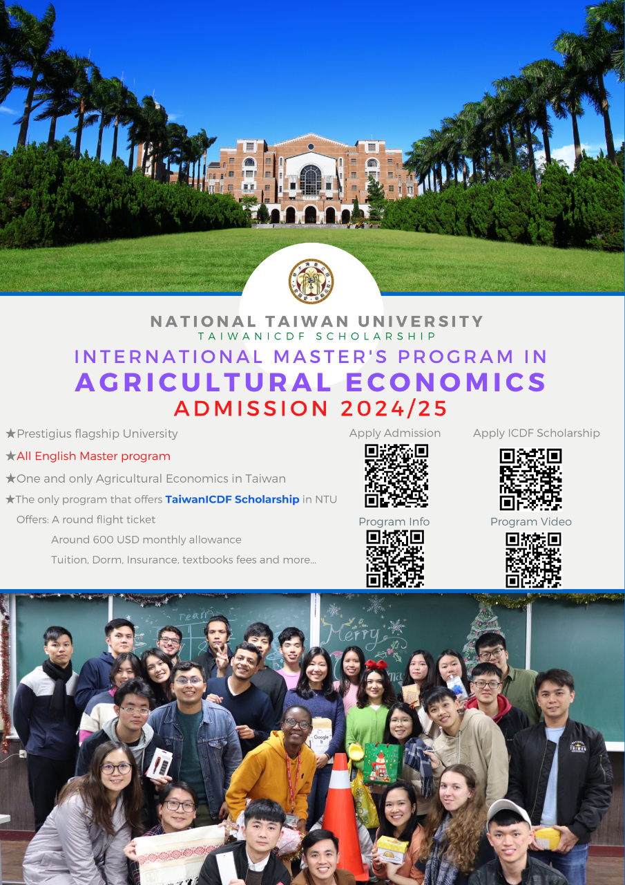 2024/25 Admission Announcement- International Master’s Program in Agricultural Economics, NTU The 2024/5 Admission for the International Master’s Program in Agricultural Economics of National Taiwan University (NTU) is now open for application.
