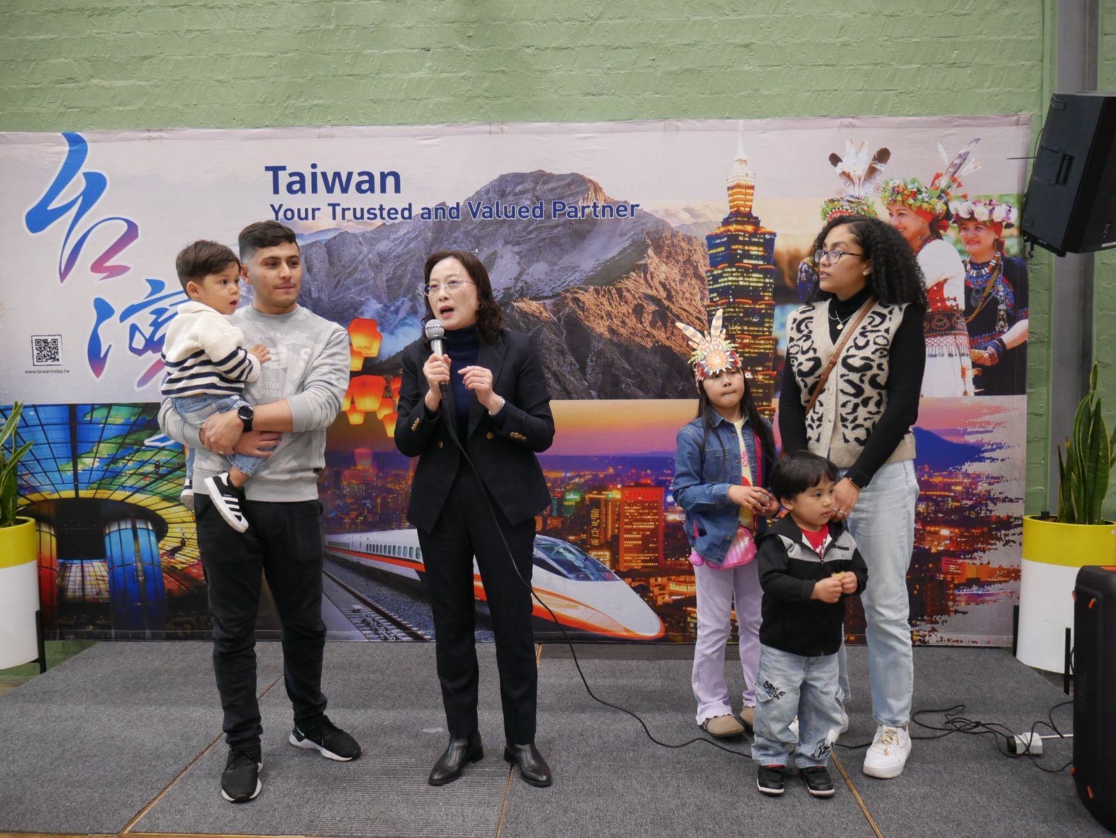 陳瑩莉處長則代表辦事處致詞,首先對到場的南非朋友表達誠摯歡迎。她指出,開普敦約有800位臺灣僑民,多年來積極參與社區慈善服務,為城市發展貢獻良多;為了讓當地民眾更認識臺灣,她感謝商會及青商會在睽違多年後再次舉辦文化節,將臺灣豐富的文化、美食與傳統呈現給南非朋友。她鼓勵現場賓客上台分享對臺灣的印象,並致贈精美臺灣筆記本及盛夏消暑飲品「臺灣啤酒」,以答謝他們的參與。青商會張家毓會長也以年輕世代的角度發言,表達對文化節重返開普敦的興奮,期盼透過美食與文化拉近南非與臺灣人民的距離,同時凝聚僑社向心力。