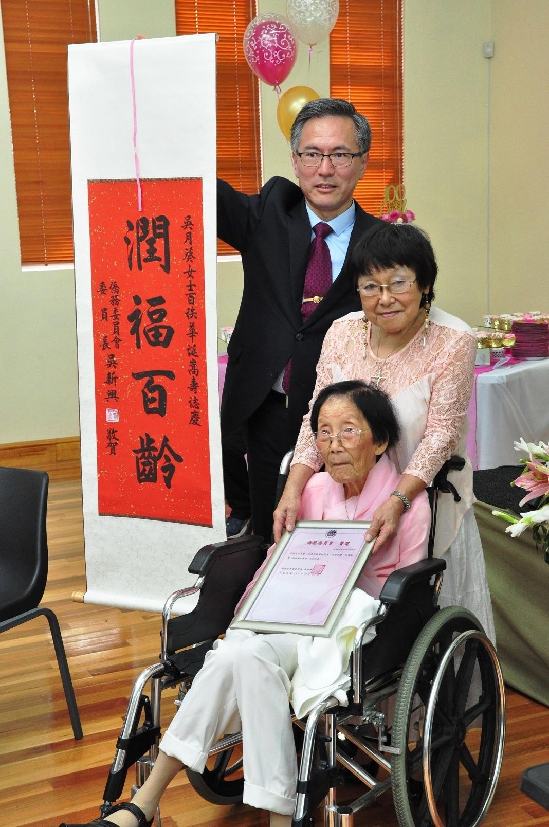王處長應邀致詞時,除讚揚吳女士長年服務社區不遺餘力,子孫滿堂並多有成就,實是偉大母親最佳典範外,並代表僑務委員會吳委員長新興頒贈「潤福百齡」賀軸及賀電予吳女士;分布美、加、澳之吳女士多名子女對吳委員長贈送之賀軸,十分感動並感謝。是日現場計有代理市長Rano Kayser、議長Jonathan Lawack、地區主教、政要、社區人士等約150人與會,氣氛溫馨並熱烈。