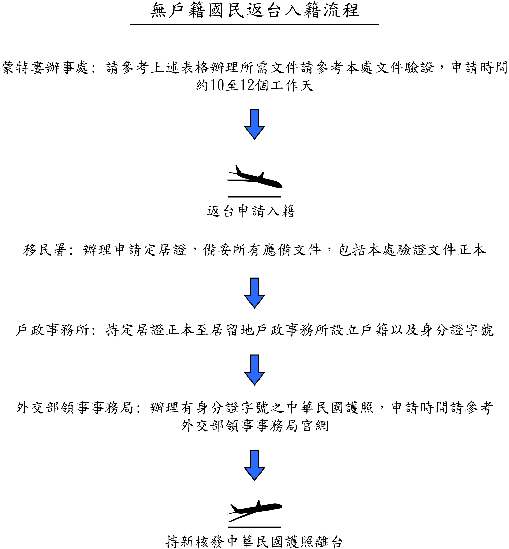 定居、設籍後首次出國時應使用載有身分證號之中華民國護照出境,始完成定居所有程序。