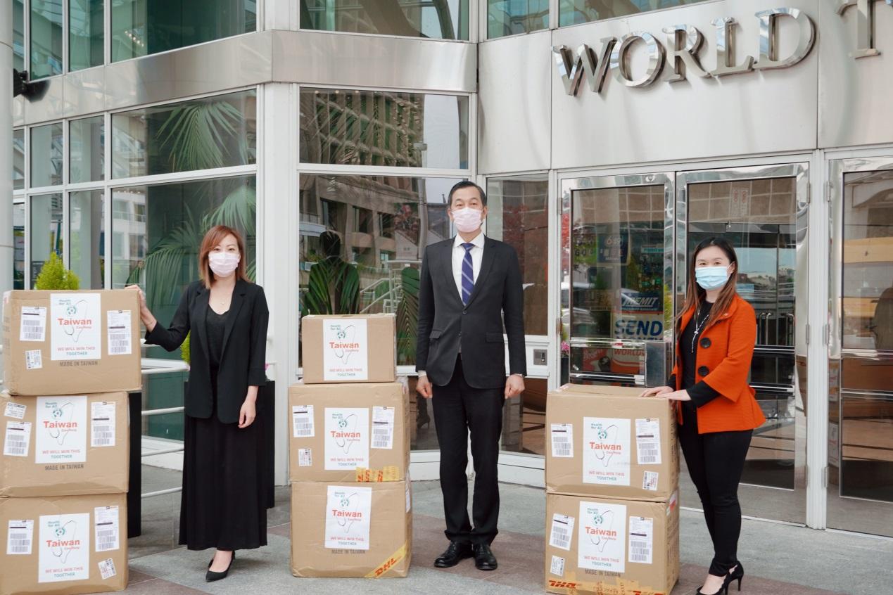 為支援加西第一線醫護人員對抗新型冠狀病毒COVID-19疫情,駐溫哥華台北經濟文化辦事處陳處長剛毅代表台灣政府於本(2020)年5月4日捐贈卑詩省政府二萬五千片醫療用口罩,以實際行動支持加國共同抗疫。卑詩省公民服務廳長康安禮(Anne Kang)及兒童照顧省務廳長陳葦蓁(Katrina Chen)代表卑詩省政府接受捐贈,並對台灣表達感謝,希望大家齊心努力一同戰勝新冠病毒疫情的挑戰。康廳長並代表卑詩省省長賀謹(John Horgan)轉致謝函。